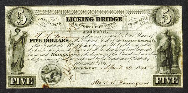 Newport, KY. 1845, 1 Share = $5, I/U, Bridge at top over title with text "Connecting Newport & Covington opposite Cincinnati", Black without underprint, allegorical woman at left and man at right, sheep and steers at bottom left, appears VF but there is a small rust stain on the lower left margin, scarce and very attractive.