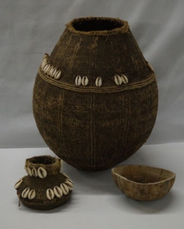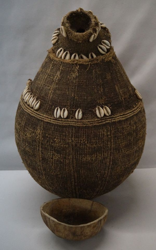 Lidded African Water Jar with Coconut Shell Cup, measures 13''H x 9''W and coconut shell cup measures 4.25''D x 2''H, cowry shell embellishments however some are missing