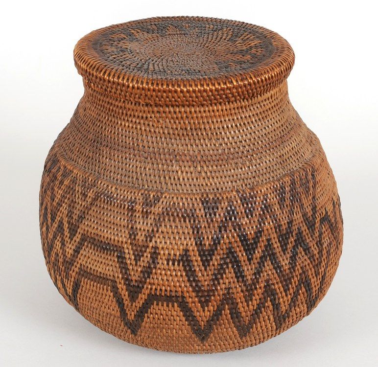 Lidded Basket with Chevron Design 9" D. 8 3/4" Good Condition