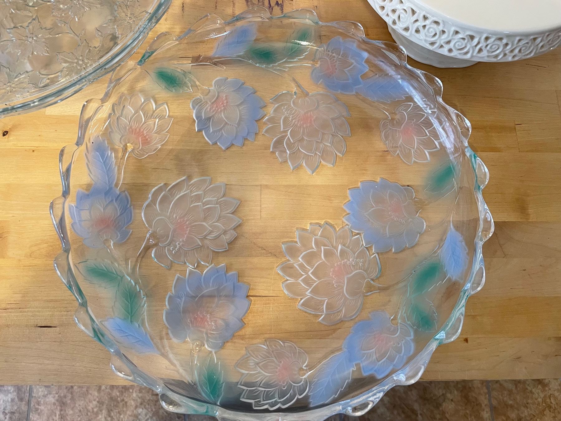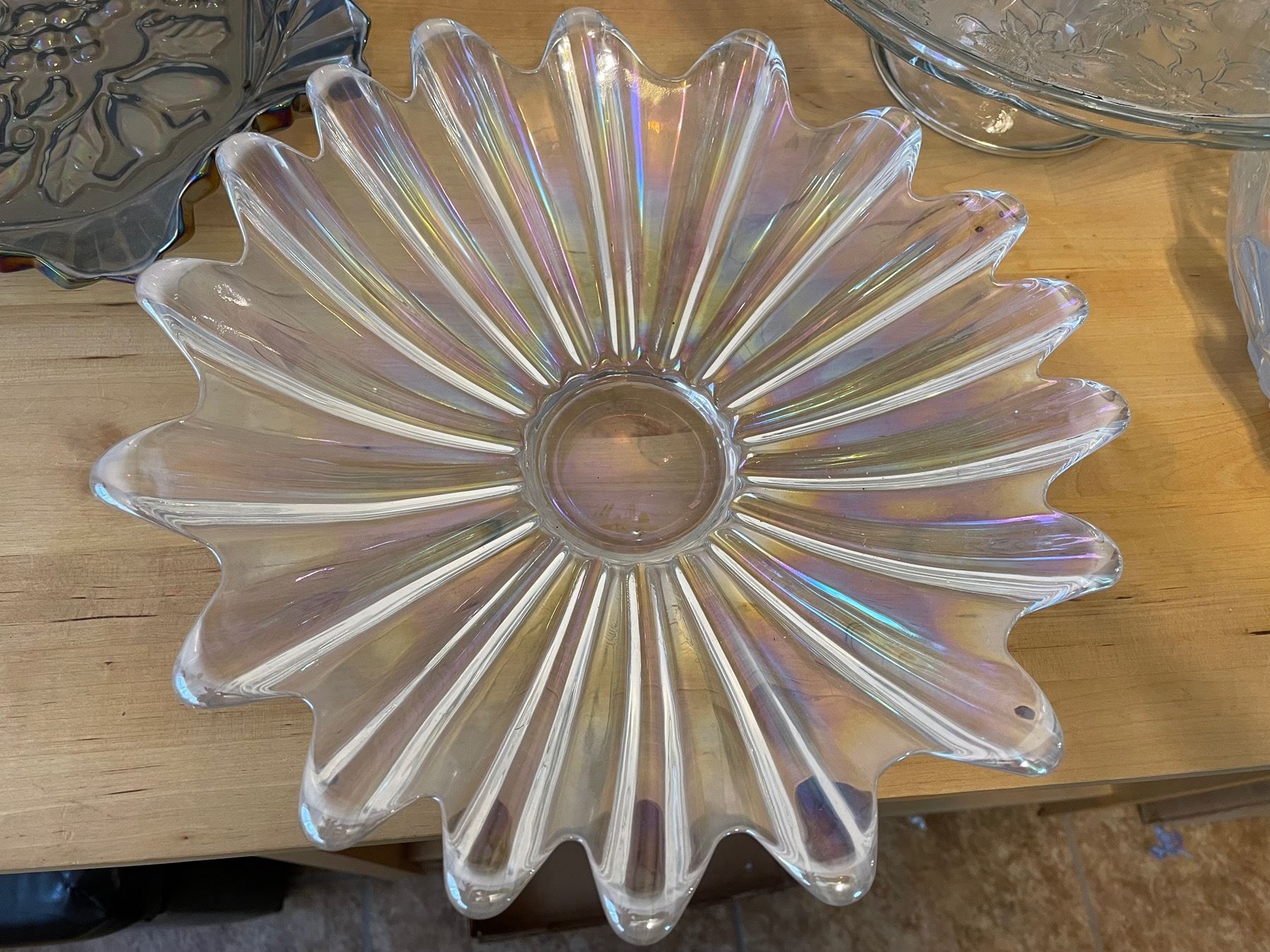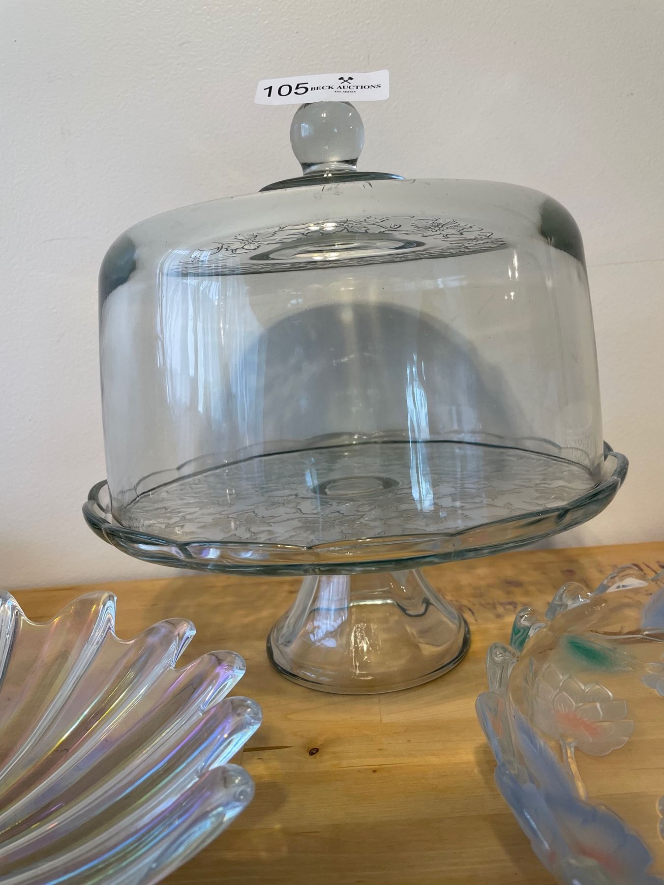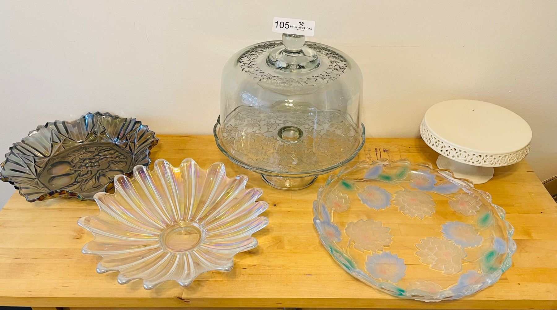 Carnival glass style bowl, satin glass platter, large lidded cake stand, etc. All in good condition with no chips or cracks.