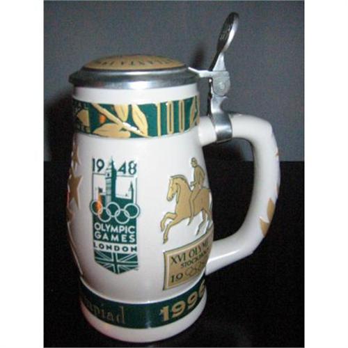 more images upon request. this is a very nice lidded beer mug. collectible and decorative . signs all over the mug. made of ceramic and pewter and reads on the lid "ATLANTA 1996" COIN "1996 " please see the images. on the body reads: picture of 5 stars, fire of olympic and under 5 rings of olympic under 100, Atlanta 1996 TM COPY WRITE c 1902 ACOG , THEN 1948 OLYMPIC GAMES LONDON- XVI OLYMPIAD STOCKHOLM 1956, IMAGES A MAN ON THE HORSE - 5 RINGS OF OLYMPICS W TOWER OF LONDON - ON THE NECK CENTENNIAL OLYMPIC GAMES- PARIS , EIFEL TOWER 1900 OLYMPIAD- 5 RINGS UNDER A CROSS FOR MELBOURNE OLYMPIC GAMES 1956- UNDER MEMORIAL COLISEUM LOS ANGELES 1932 OLYMPIC GAMES - ON THE BOTTOM 1896 XXVI OLYMPIAD - ON THE BASE AND BOTTOM OF THE MUG READS: Handcrafted expressly for anheuser busch, inc. by ceramarte of Brazil - under reads: CENTENNIAL 100 OLYMPIC GAMES AND NUMBERED WITH GOLD 04040- UNDER READS: Official Games Stein Collector's Edition, under reads: 1995 Anheuser-Busch, Inc. St. Louis, MO. in green colors - gold - beige and cream as well as red- THESE ARE ALL BEING ENCRYPTED. HAND MADE AND YOU CAN TOUCH AND FEEL ALL THE IMAGES ON THE MUG AS WELL AS WRITINGS. mesures 8 inches tall, base is 4 inches in diameter, handle is crafted as well with stars of olympic. excellent condition. no chip - crack or crackle. just normal wear and tear for being vintage. something to think about.