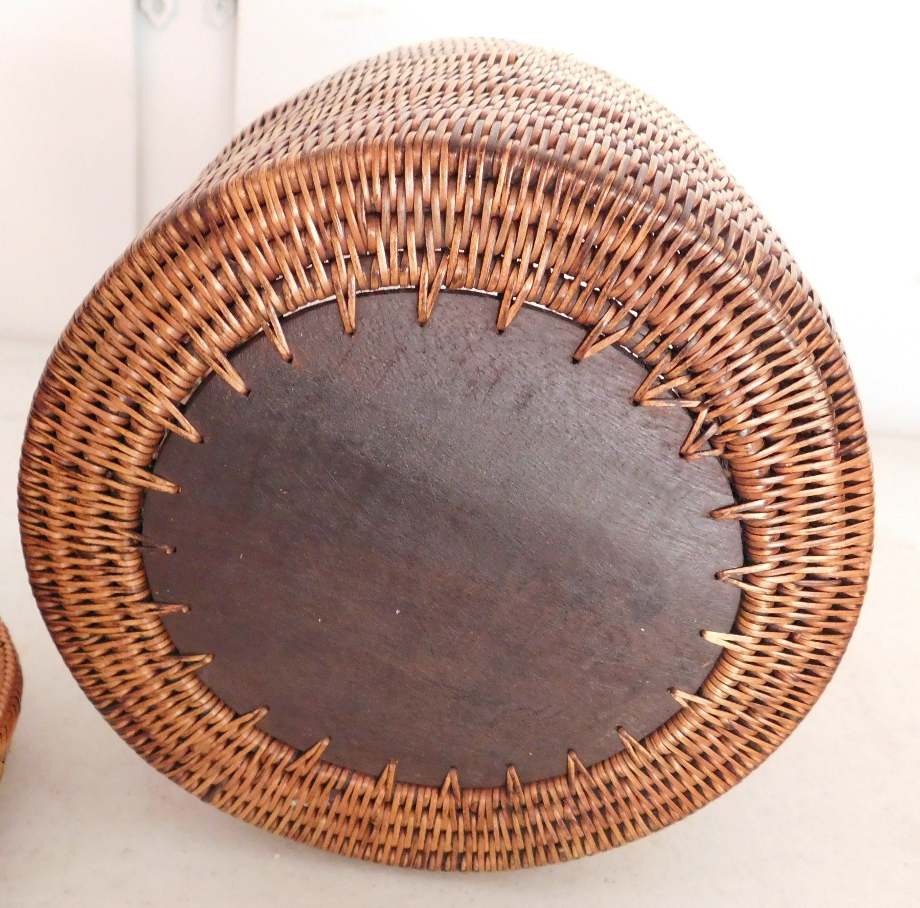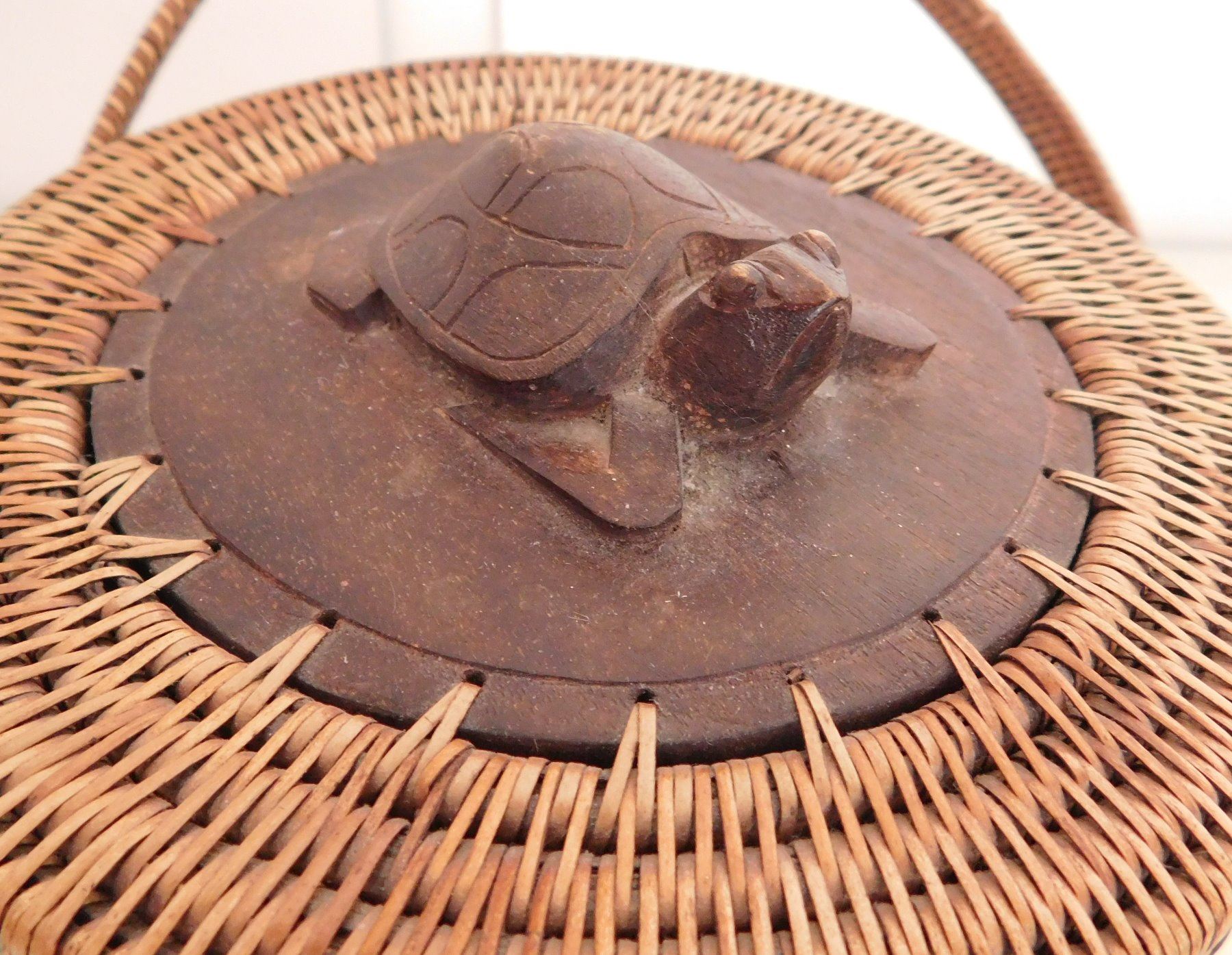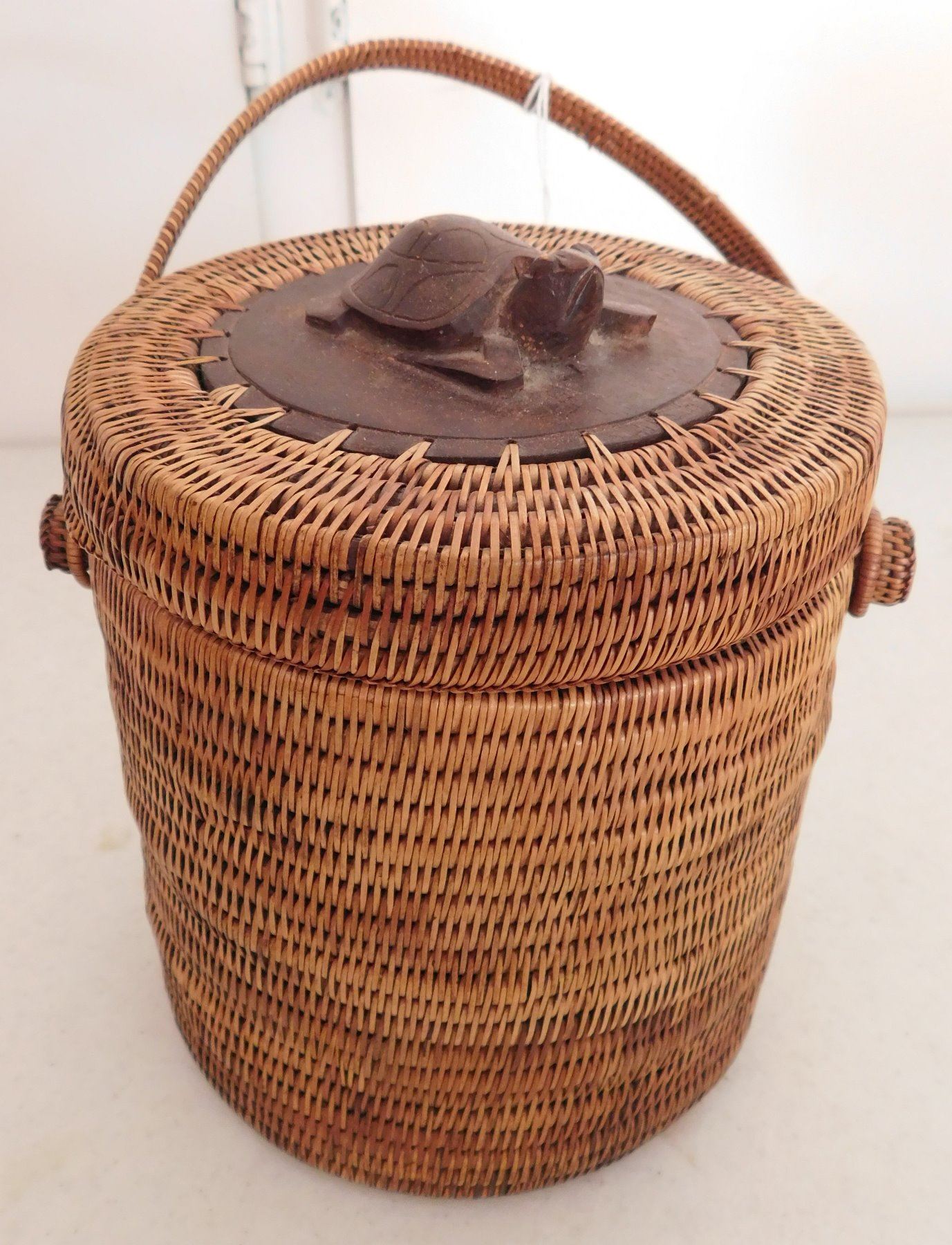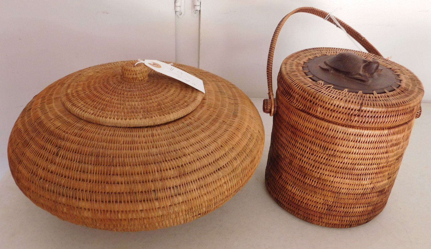 Lidded Indonesian Baskets, c. 1960s. Made of wood and stripped bark, the items measure 11" x 6" x 11" and 7" x 6" x 7". Indonesia. Wood figure of frog on lid of smallest basket. Condition: Good, see images. Shipping: $30.00 USA estimate only, w/insurance and signature.