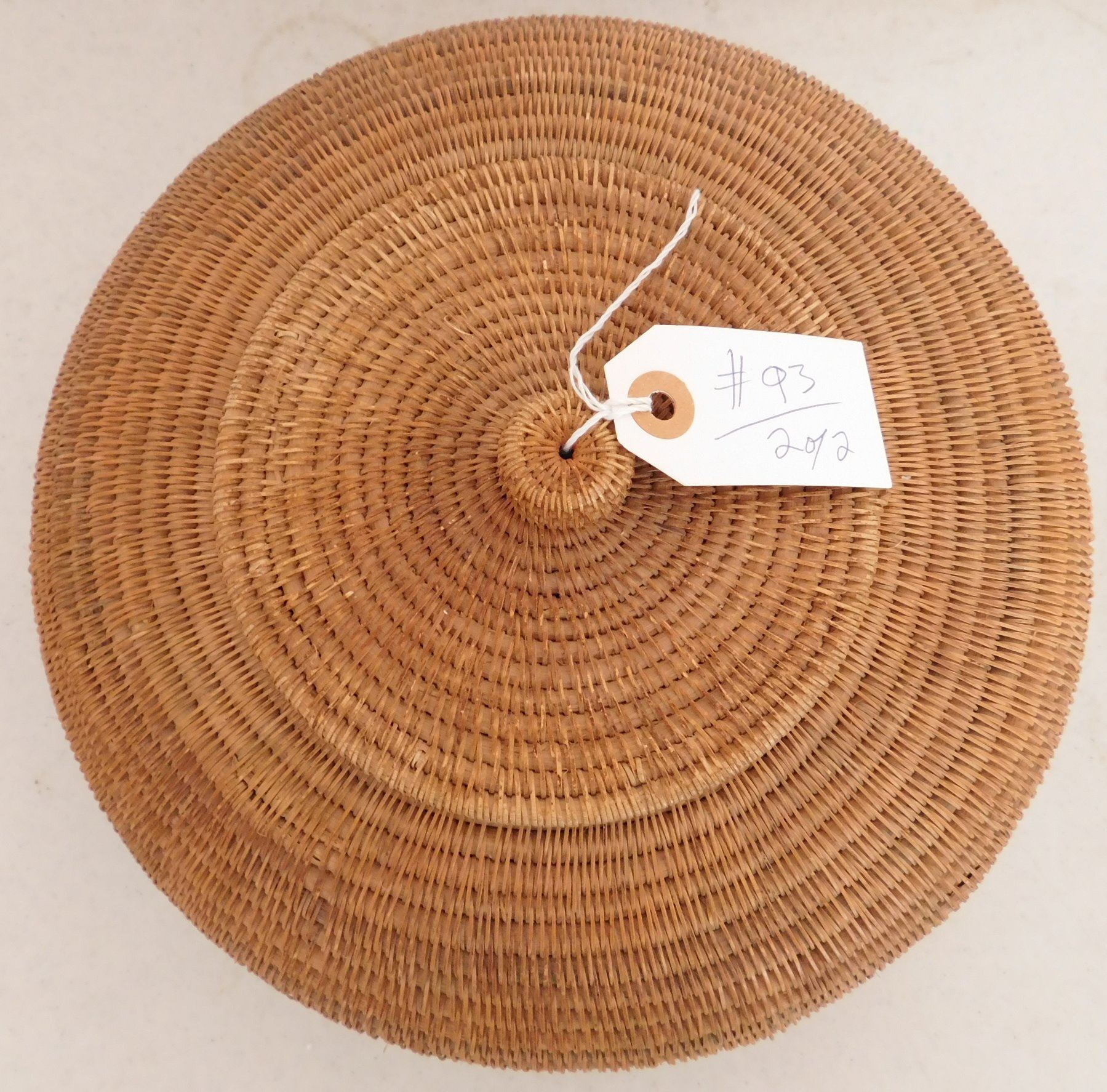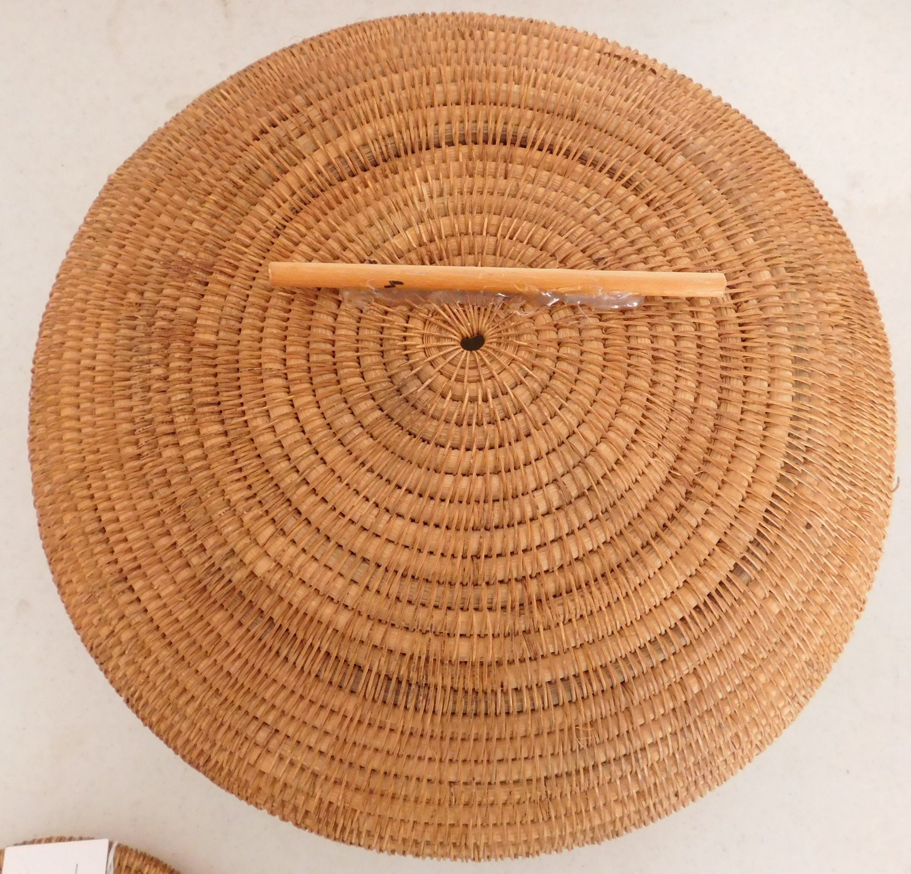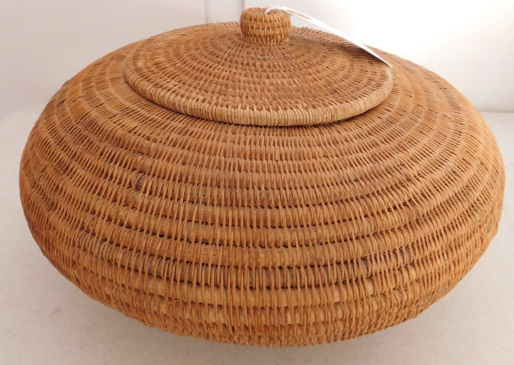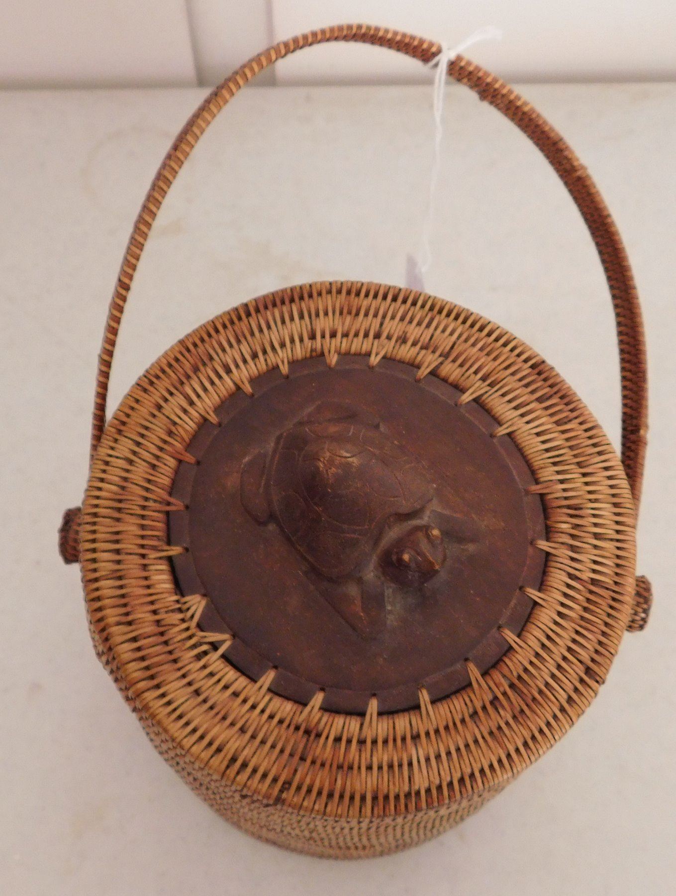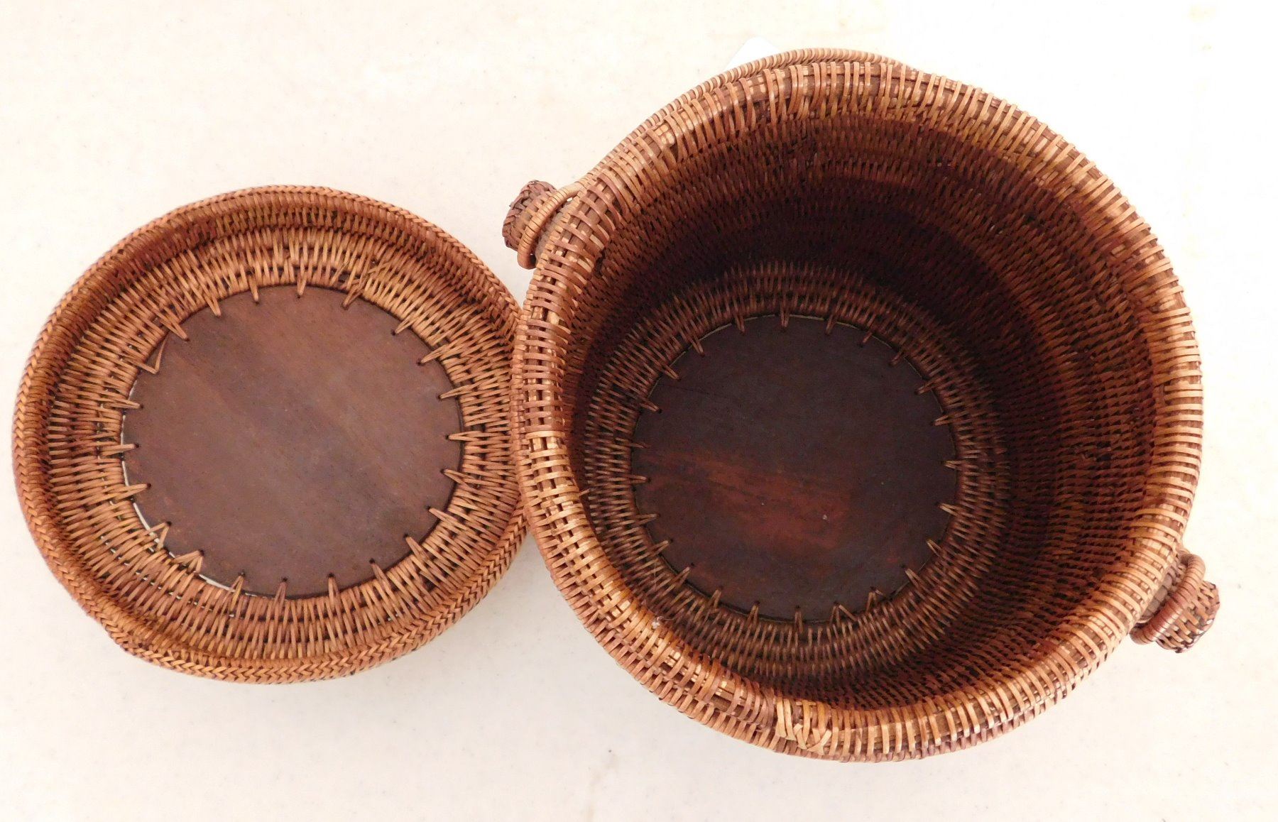 Lidded Indonesian Baskets, c. 1960s. Made of wood and stripped bark, the items measure 11" x 6" x 11" and 7" x 6" x 7". Indonesia. Wood figure of frog on lid of smallest basket. Condition: Good, see images. Shipping: $30.00 USA estimate only, w/insurance and signature.