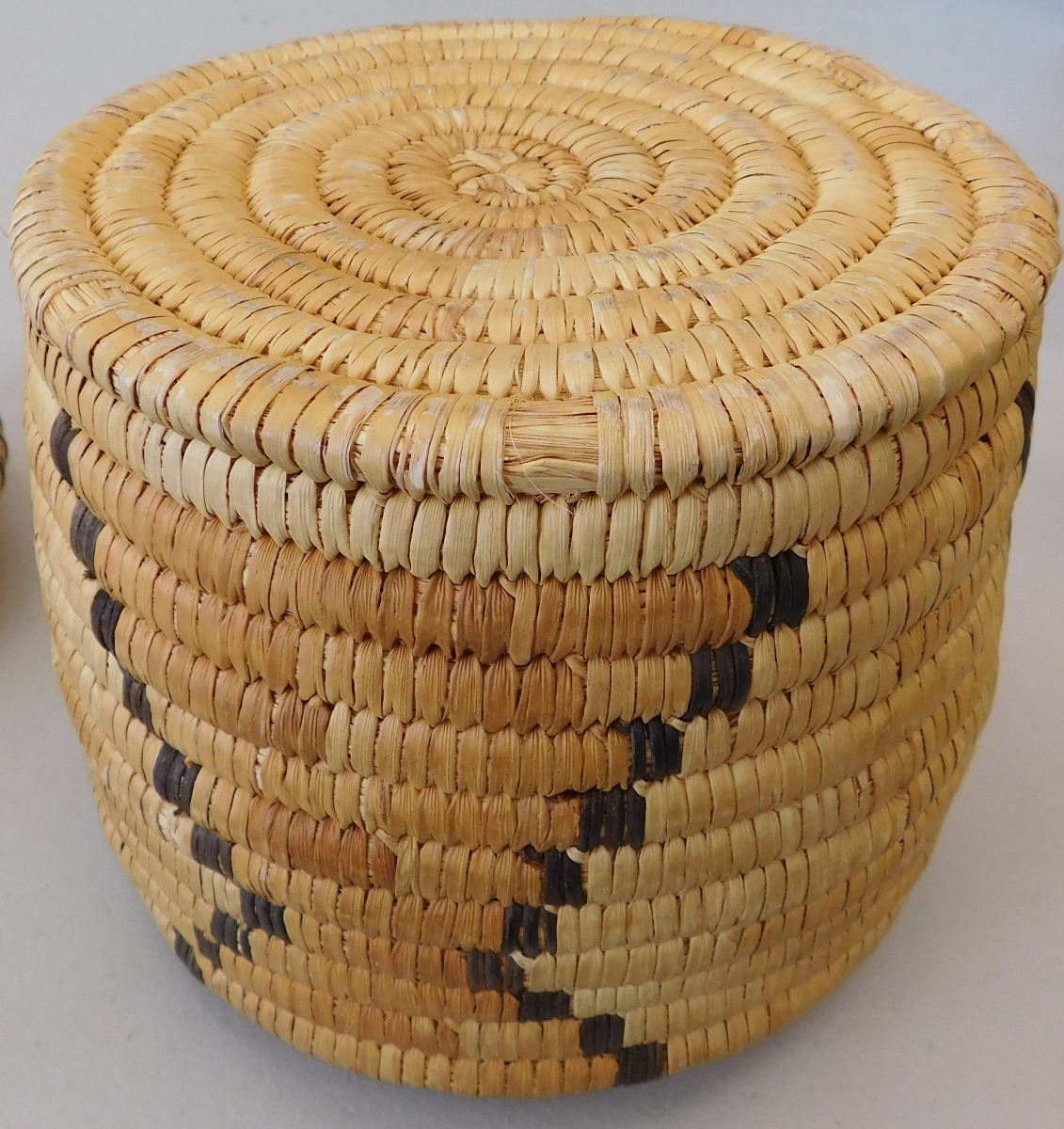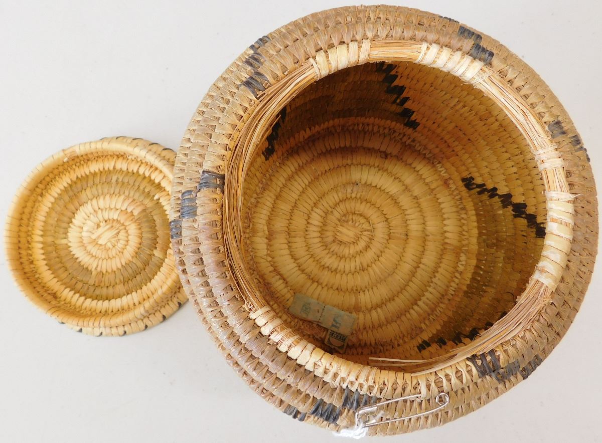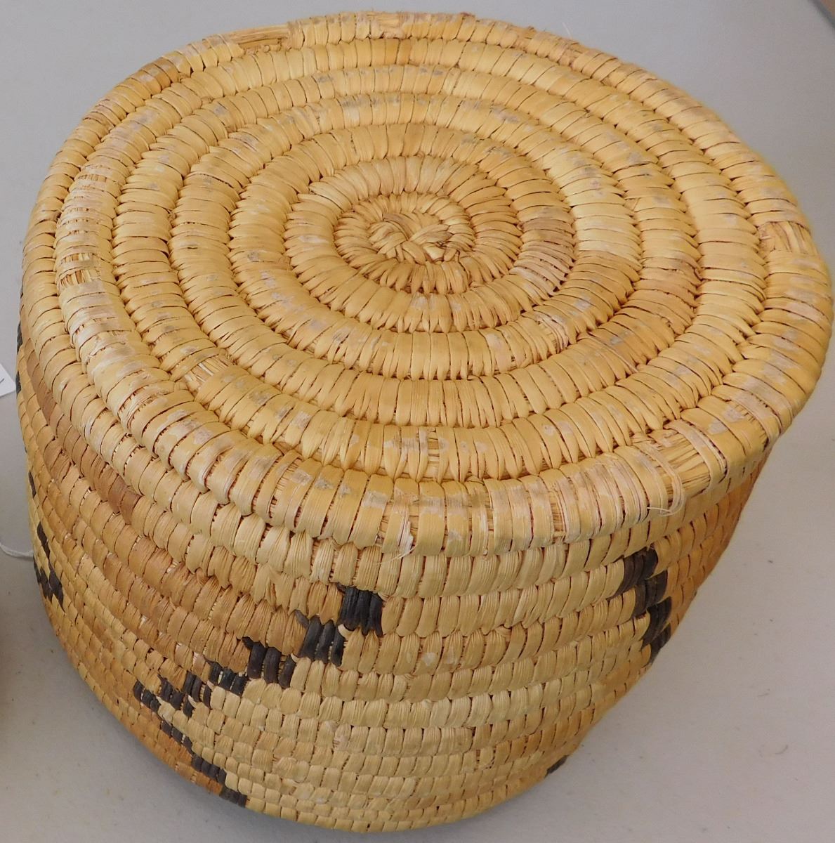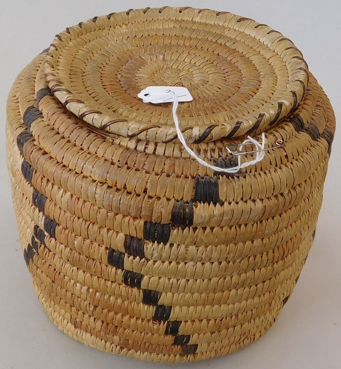 Lidded Papago Basket, circa 1940s. Basket has a nice design. Item is made from yucca and devil's claw and measures 7 x 7 inches. Papago, Southern Arizona. Condition: Minor wear from use, see images. Shipping: $16.50
