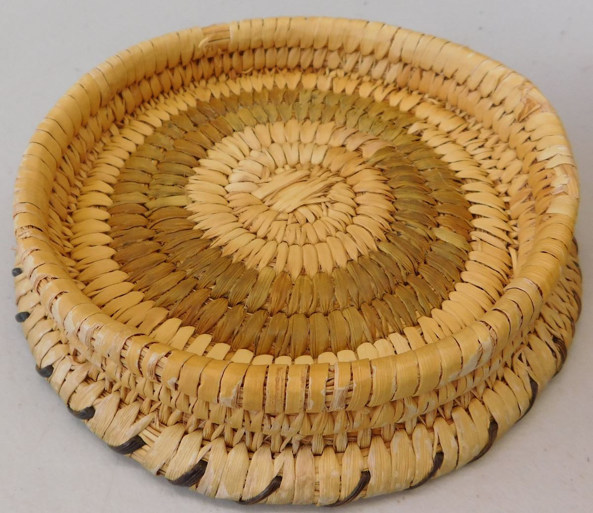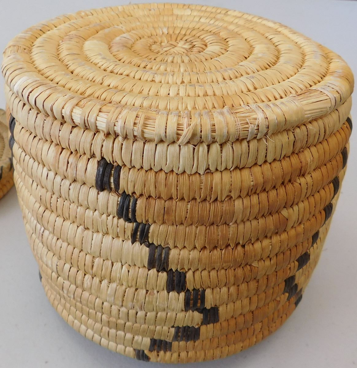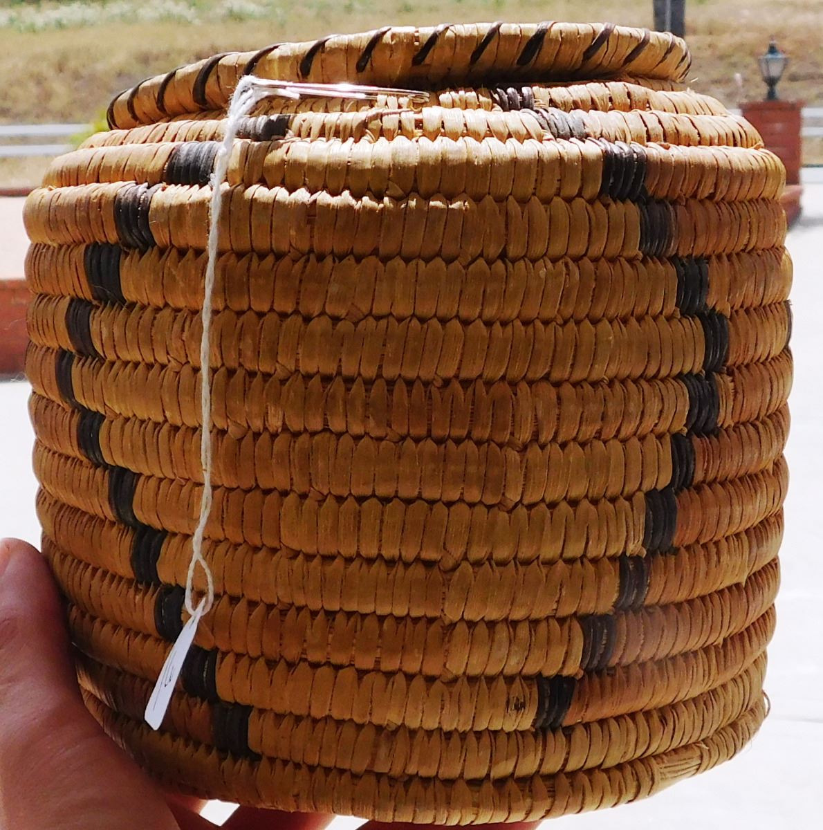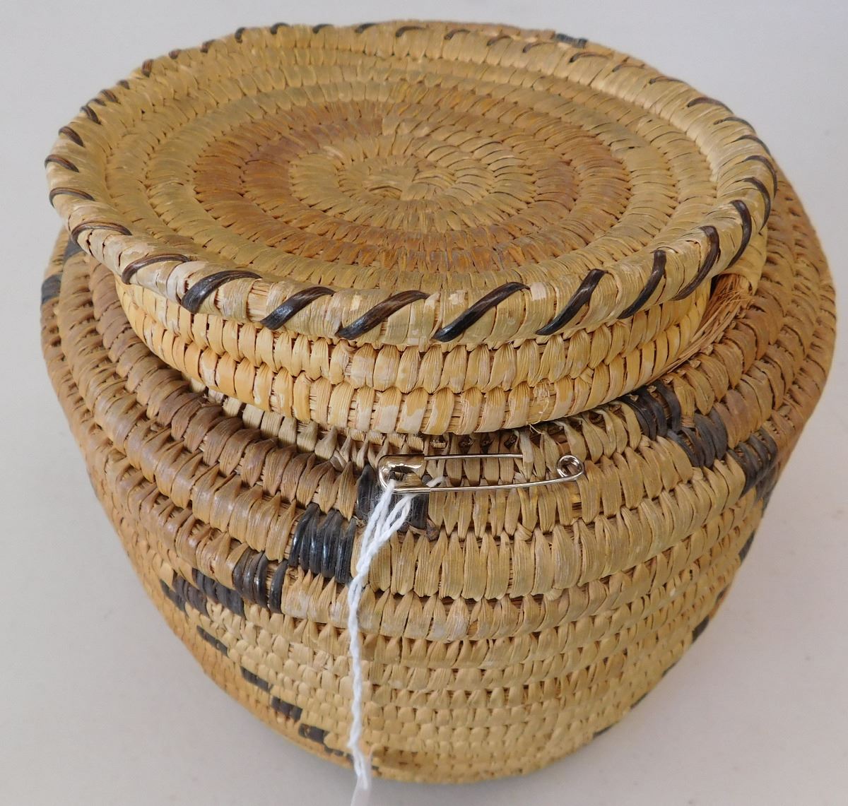 Lidded Papago Basket, circa 1940s. Basket has a nice design. Item is made from yucca and devil's claw and measures 7 x 7 inches. Papago, Southern Arizona. Condition: Minor wear from use, see images. Shipping: $16.50