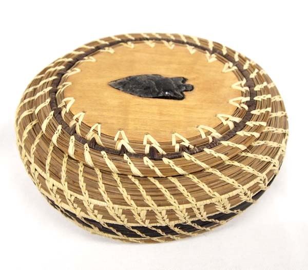 Pine Needle Basket by Jinny Newt, hand chipped obsidian arrowhead embedded in bass wood and pine needle lid, bottom is pine needle and bass wood construction, measures 2.5'' x 5.5''D, provenance included