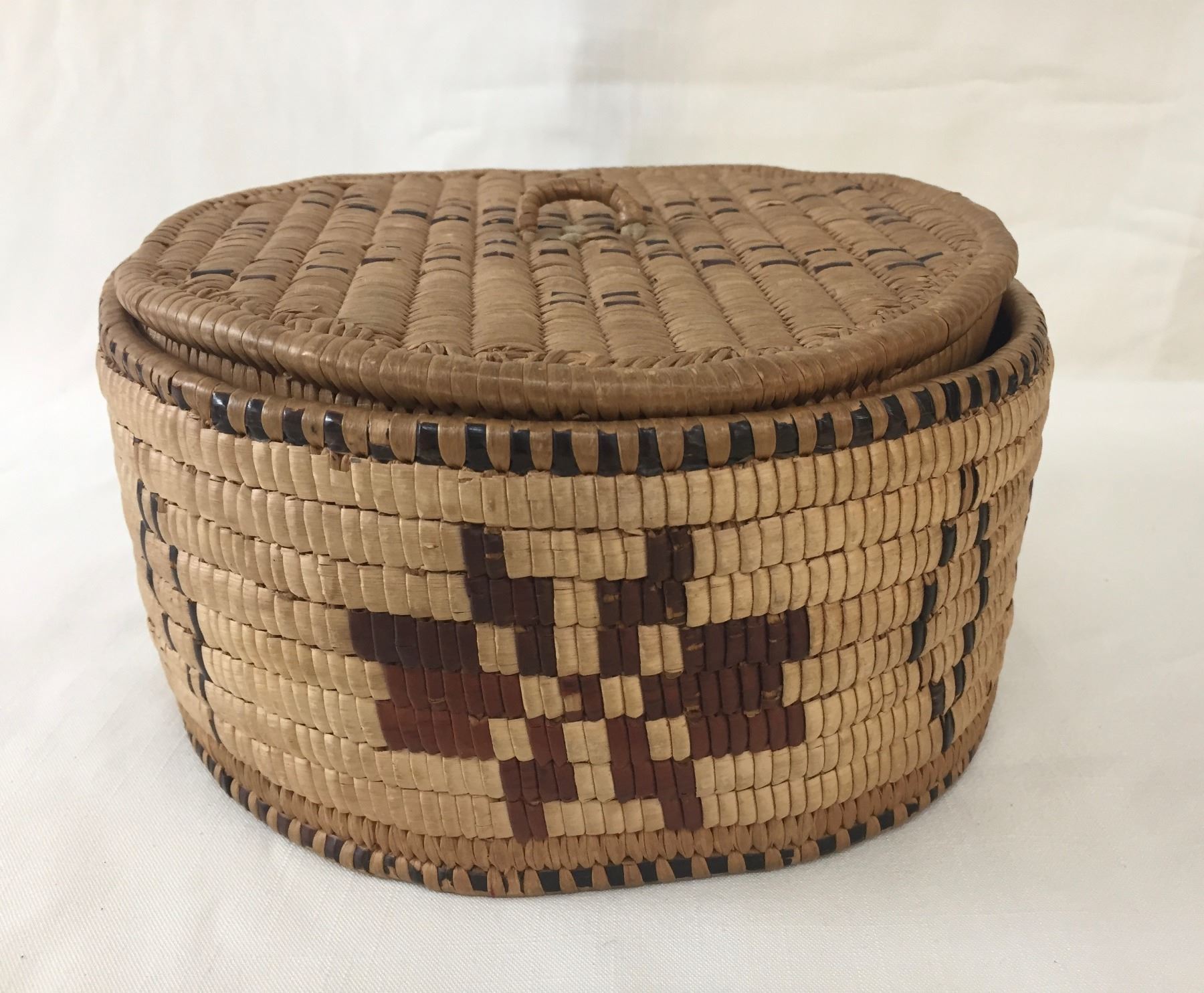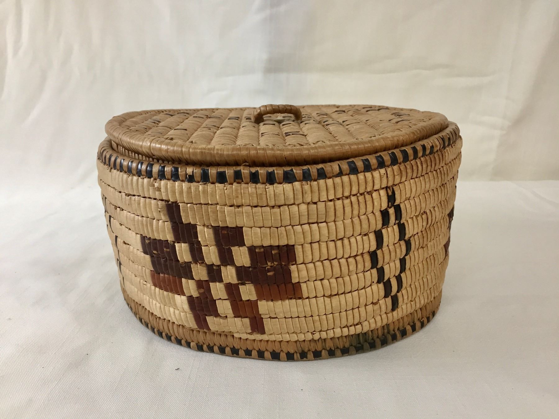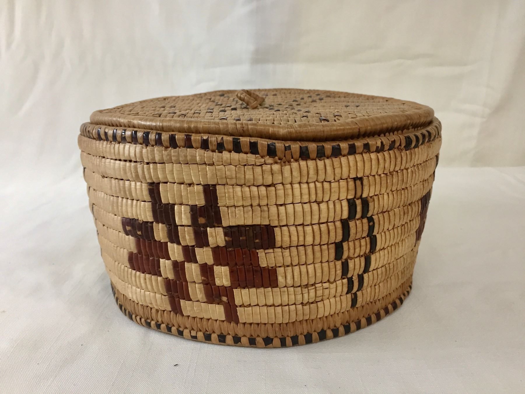 Description: Presented for sale in this lot is a Salish Lidded Basket in very nice condition. This basket features geometric designs. Maker: Unknown Salish weaver. Approx. Age: Circa 1930s - 1950s. Size: 9”w x 4-5/8” tall. Condition: Good for its age, normal wear expected. Please look closely at the pictures - they are an important part of our description. Shipping: There will be a $10 handling / packaging fee for shipping this lot. The actual cost of postage will be added on top of that.