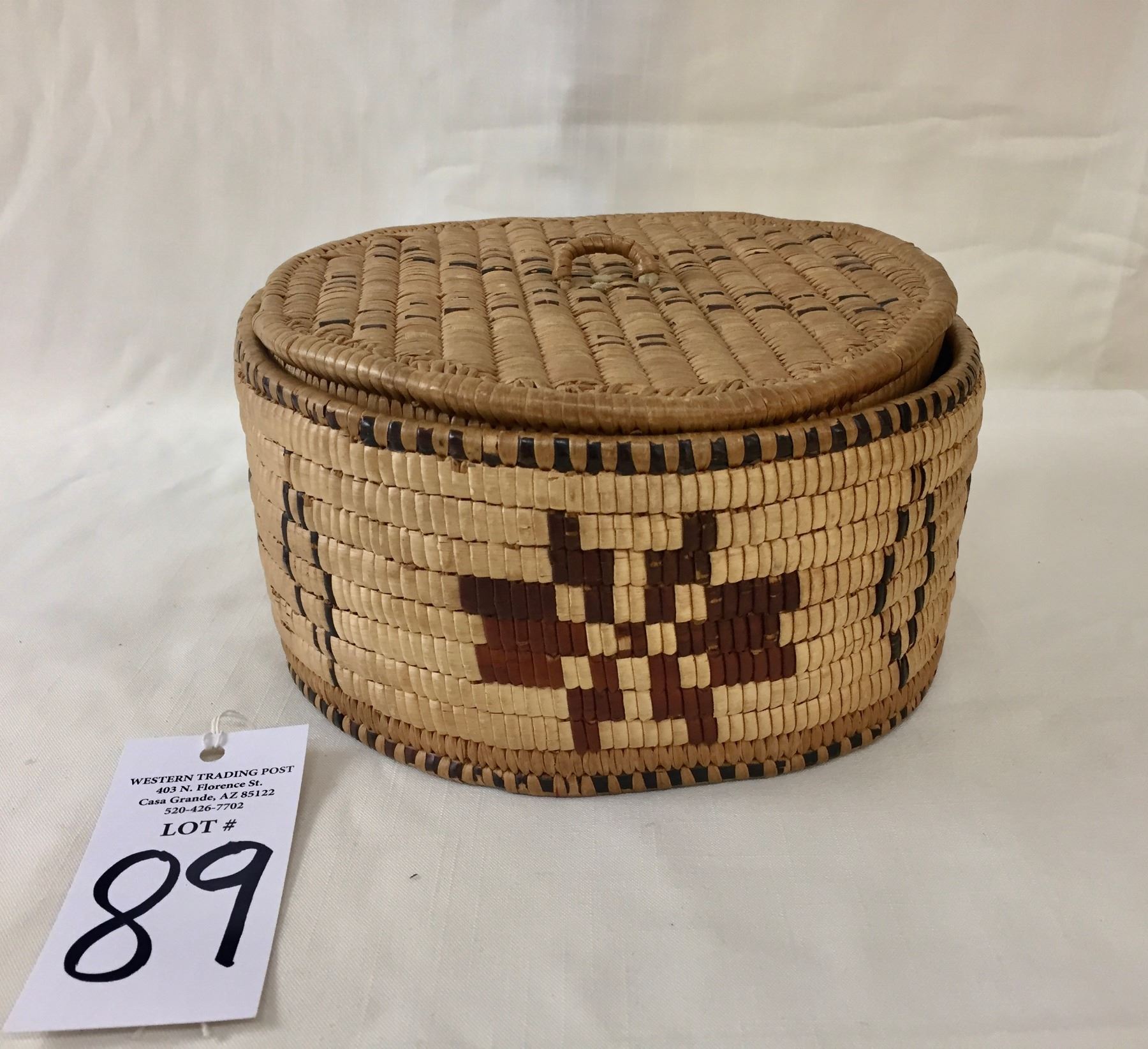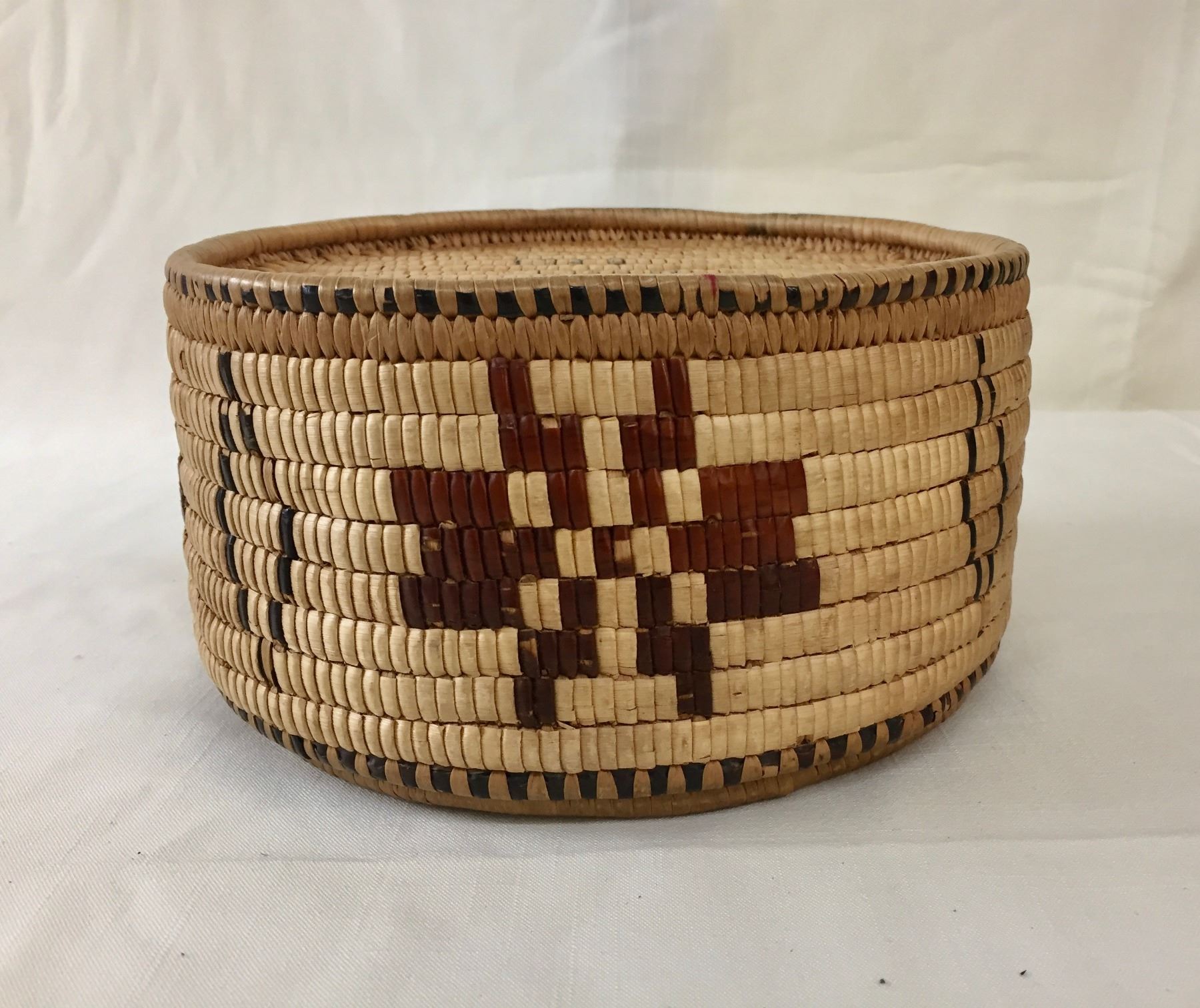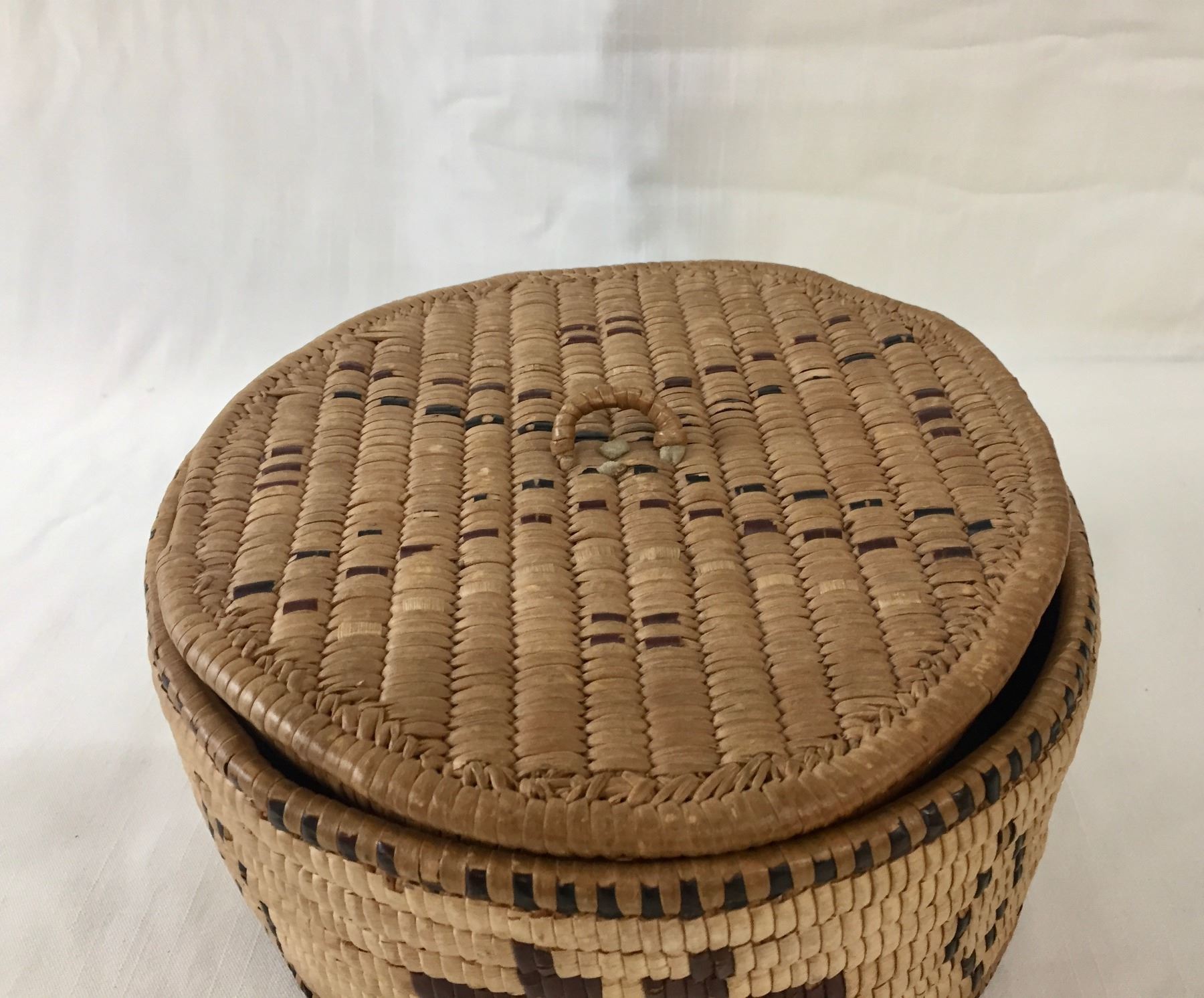 Description: Presented for sale in this lot is a Salish Lidded Basket in very nice condition. This basket features geometric designs. Maker: Unknown Salish weaver. Approx. Age: Circa 1930s - 1950s. Size: 9”w x 4-5/8” tall. Condition: Good for its age, normal wear expected. Please look closely at the pictures - they are an important part of our description. Shipping: There will be a $10 handling / packaging fee for shipping this lot. The actual cost of postage will be added on top of that.