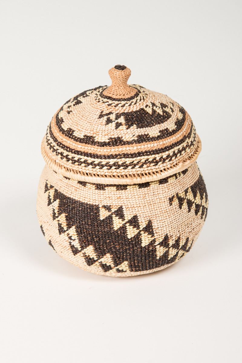 Lidded Trinket Basket by Florence Jacobs Harrie (1889-1981) (Karok). 5 ¾" x 5". Black and cream colors.