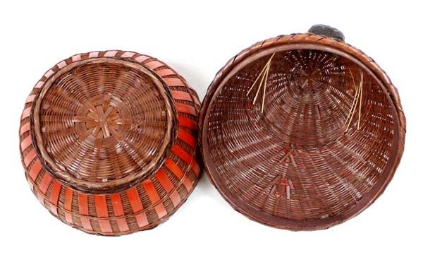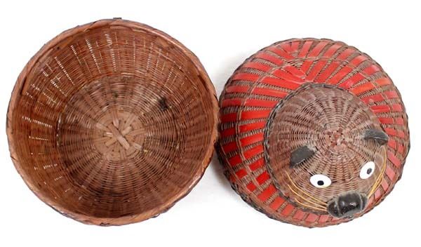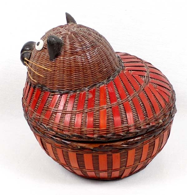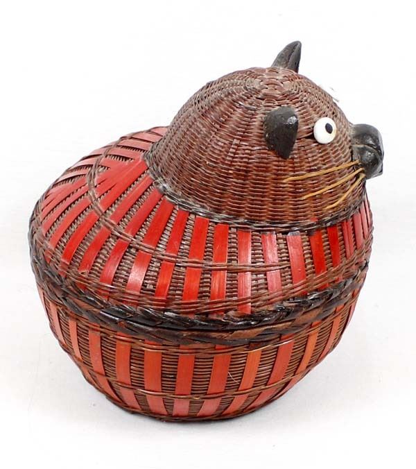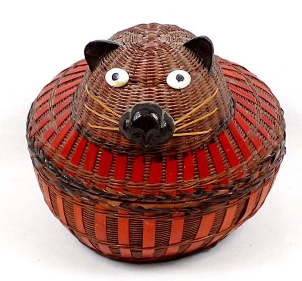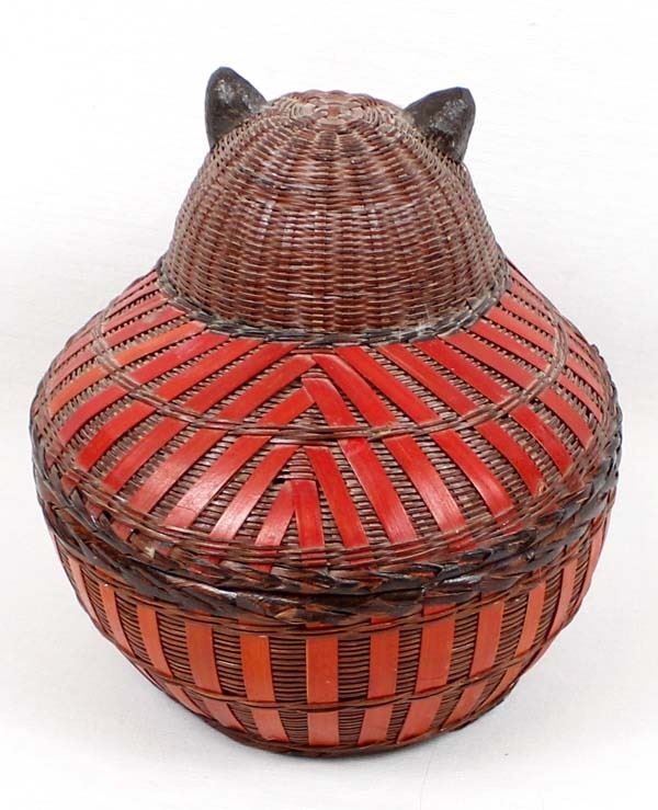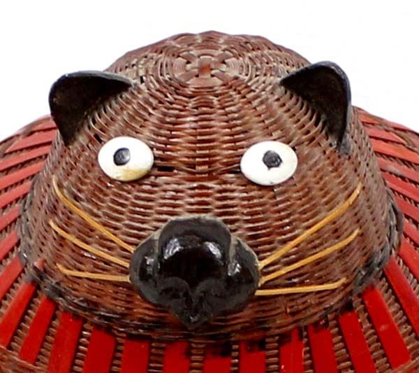 Lidded Wicker Cat Basket, multi-toned, measures 6'' x 6''