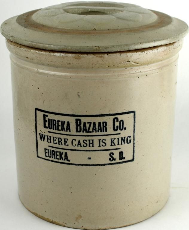 Lidded crock beater jar marked Eureka S. Dak., Eureka Bizarre Co where cash is king, 8" tall showing some light flake chips to bottom edge otherwise very good. Est. 250-450