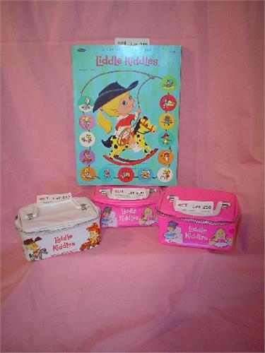 "Liddle Kiddles" by Mattel, Coloring Book & 3 Doll Purses/Cases (2 pink cases 1967 & white case 1965)