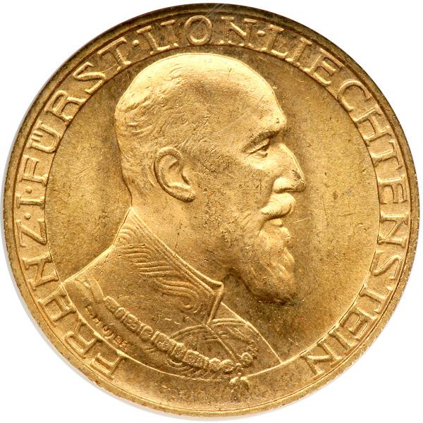 Liechtenstein. 20 Franken, 1930. Fr-15; KM-Y12. Franz I, 1929-1938. Mintage 2,500. Head right. Reverse: Arms. One year type. NGC graded MS-65.