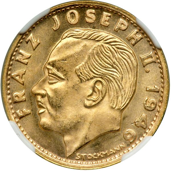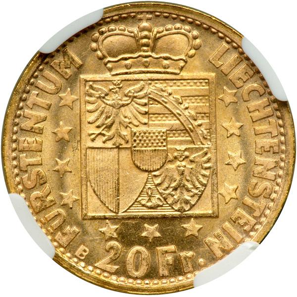 Liechtenstein. 20 Franken, 1946B. Fr-17; KM-Y14. Franz Joseph II. One year type. NGC graded MS-65.
