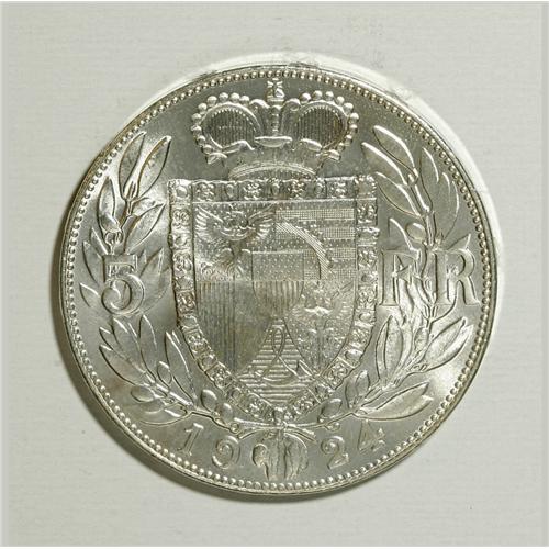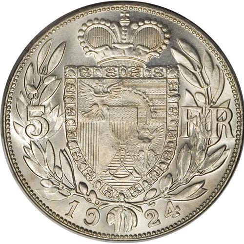 <B>Johann II 5 Franken 1924, </B></I>KM-Y10, brilliant UNC, stunningly bright and lustrous, one of the finest business strikes of any coin that you will ever see!<BR><BR><b>Shipping:</b> Coins & Currency (<a target="_blank" href="http://www.heritageauctions.com/common/shipping.php">view shipping information</a>)
