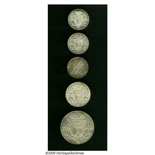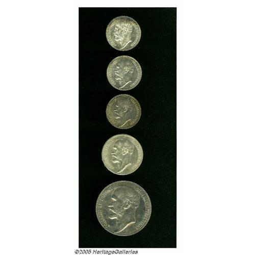 <B>Johann II Attractive Silver Selection, </B></I>KM-Y2 Krone, three dates: 1900, choice BU, 1904, XF-AU, and 1910, toned XF-AU, KM-Y3 2 Kronen 1912, cleaned XF, and KM-Y4 5 Kronen 1904, lightly toned XF-AU. <B>Sold as is, no return lot.</B></I>