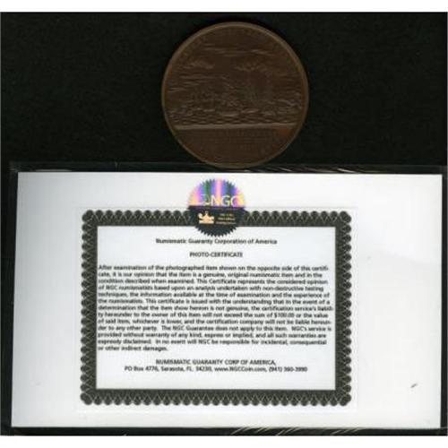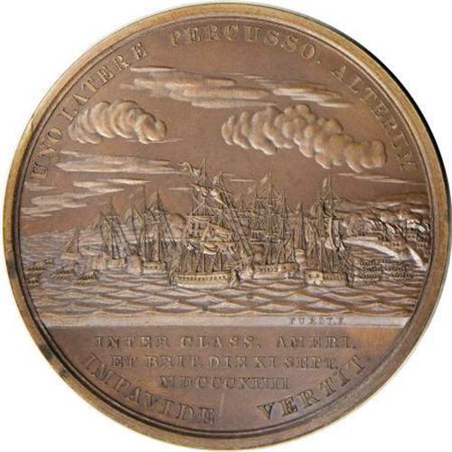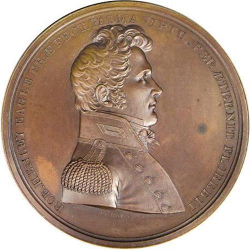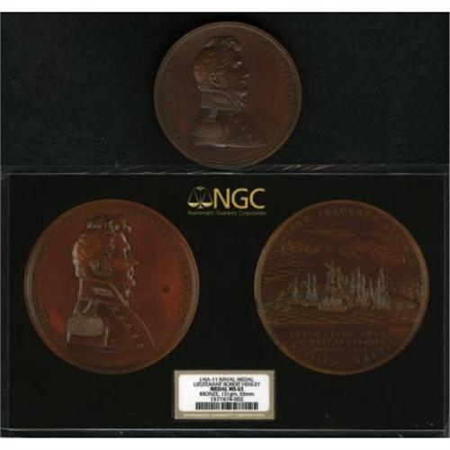 <B>Lieutenant Robert Henley Naval Medal, Julian-NA-11, MS63 NGC.</B></I> Bronzed copper, 65 mm, 131.0 gm. Dies by Moritz Furst. Obverse bust right, legend around ROB. HENLEY EAGLE PRAEFECT. PALMA VIRTU. PER AETERNIT. FLOREBIT ("Robert Henley, commander of the Eagle, the palm of courage will flower for all time"), FURST.F. below. Reverse (same as Cassin medal, Julian-NA-8) naval battle scene, around and in exergue UNO LATERE PERCUSSO. ALTERUM IMPAVIDE VERTIT. INTER CLASS. AMERI. ET BRIT. DIE XI SEPT. MDCCCXIIII ("Beaten on one side, he fearlessly turns the other / Between the American and British fleets September 11, 1814), FURST.F. at right on exergual line. Original reverse die, lacking the C.B. (for Charles Barber) of the later reproduction.<BR> Generous dollops of mint luster abound on both sides of this mahogany-brown piece, held back from a finer grade by a couple of light carbon spots. Comes with an NGC Photo Certificate. An example in the notable Kessler-Spangenberger sale (NASCA, 4/1981, lot 1700), Choice Unc., brought $180 against a presale estimate of $125..<BR><BR><b>Shipping:</b> Coins & Currency (<a target="_blank" href="http://www.heritageauctions.com/common/shipping.php">view shipping information</a>)