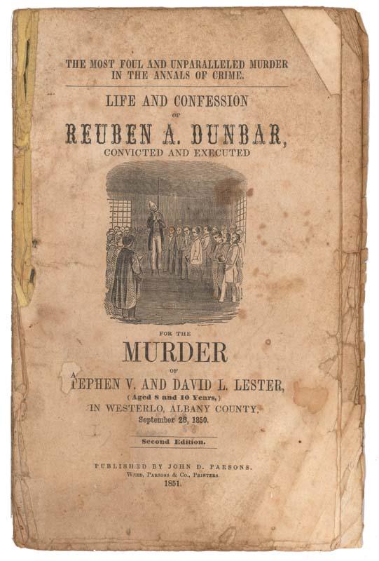 The Most Foul and Unparalleled Murder in the Annals of Crime Life and Confession of Reuben A. Dunbar, Convicted and Executed for the Murder of Stephen V. And David L. Lester (Aged 8 and 10 Years,) In Westerly, Albany County, September 28, 1850. twenty-nine pages, 6” x 9 1/2”. Second Edition. Published by John D. Parsons. Weed, Parsons & Co., Printers. 1851.The account is broken into the following sections: Introduction,” Confession,” Farewell Lines,” Sketch of the two boys, David L. and Stephen V. Lester, who were murdered by Reuben A. Dunbar,” and Confession of Reuben Dunbar, of the Murder of Stephen V. and David L. Lester.” Cover illustration depicts the hanging of Dunbar and the final section of the pamphlet includes two illustrations of the murders. Toning throughout. Edge wear and paper loss. Yellow paper cover missing. String bound. Overall Good.