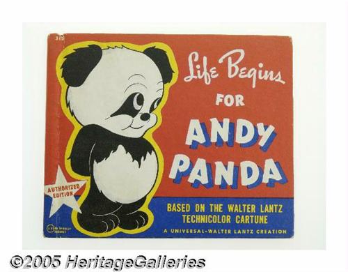 <B>Life Begins For Andy Panda (Rand McNally, 1940) Condition: VG+.</B></I> On Sept. 9, 1939, Universal-Walter Lantz released "Life Begins for Andy Panda," a play on an Andy Hardy film title. Rand McNally published this 5.5" x 5.5" book in 1940, based on the short film. Color and black and white interior illustrations. Some slight edge wear and slight tears on the cover at the upper spine, but the contents are strong. <I>From the Larry Jacobs Collection.</B></I>