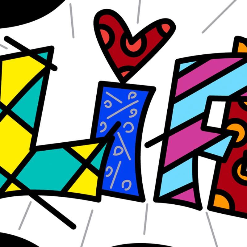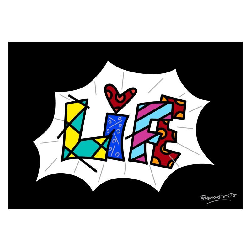 "Life Black Mini Word" is an open edition giclee on canvas by Romero Britto. The piece comes hand signed by the artist and is authenticated en verso with the official Britto stamp. Measures approximately: 5" x 7".