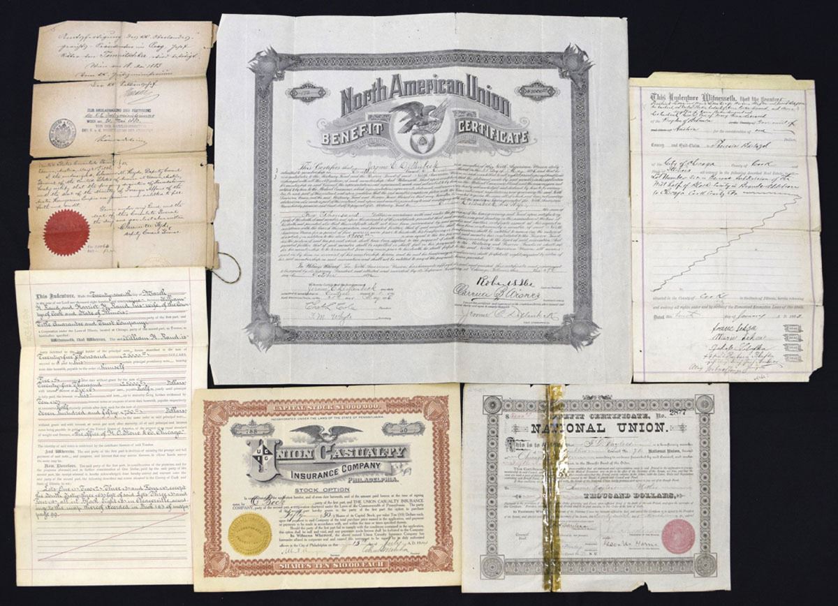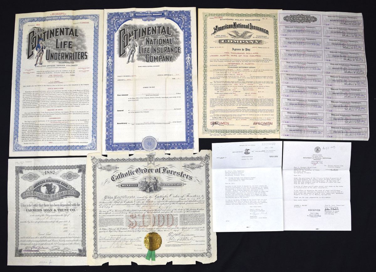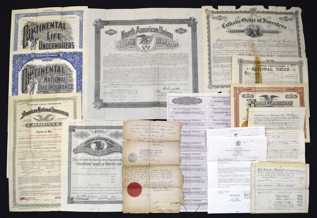 Various States, ca.1880s-1960s. Lot of 10+ issued stock certificates, insurance benefit certificates, and related documents from U.S. fraternal and life insurance companies. Highlights include: Continental Life Underwriters and Continental National Life Insurance Co. specimen and issued stock certificates with colorful allegorical vignettes; Catholic Order of Foresters $1,000 benefit certificate; North American Union Benefit Certificate with eagle vignette; Union Casualty Insurance Co. ornate stock option certificate; National Union benefit certificate with embossed gold seal and tape repair; American National Insurance Co. specimen policy form; and Mutual Benefit Life Association of America deposit certificate dated 1887. Also included are handwritten benefit agreements with wax seals, correspondence from the Illinois Department of Financial Institutions, and additional related ephemera. A visually striking group spanning issued, specimen, and policy forms, showcasing the breadth of U.S. life insurance and fraternal organizations. Condition ranges from Fine to VF, some with folds, staining, or tape repairs. (10+). Sold "AS IS" no returns accepted.