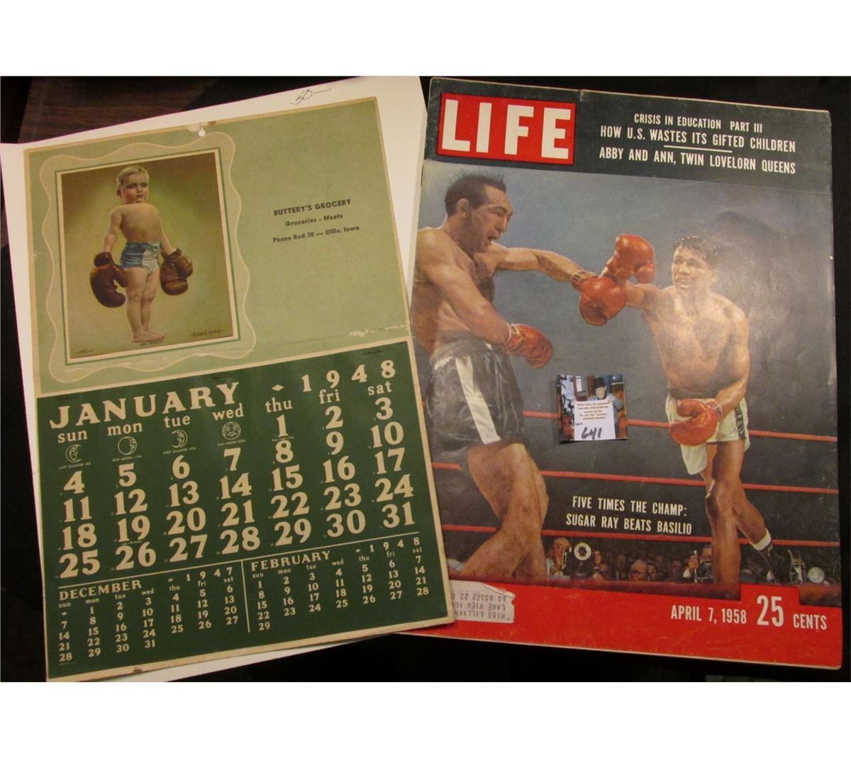 "Life" Magazine April 7, 1958 "25 cents" Cover art features "Five Times the Champ: Sugar Ray Beats Basilio"; & 1948 "Buttery's Grocery Groceries-Meats Phone Red 38 -Ollie, Iowa", depicts young boy with boxing gloves.