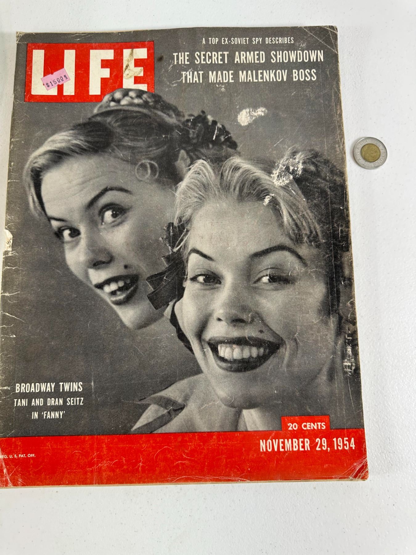 Original Life Magazine featuring Broadway twins in Fanny on the cover and a Camel Cigarettes ad with Teresa Wright on the back cover. Condition: Fair with creasing and small edge wear.