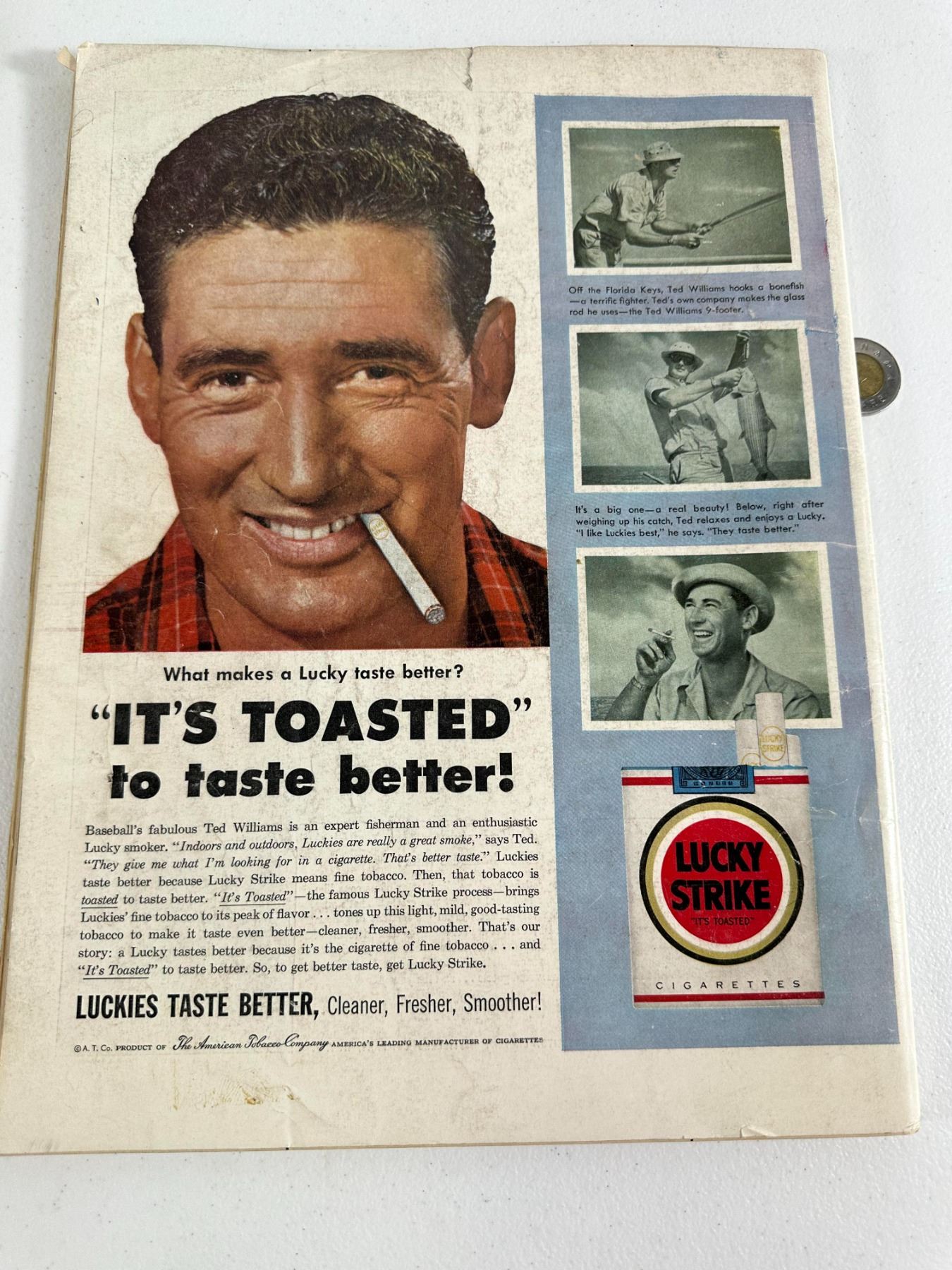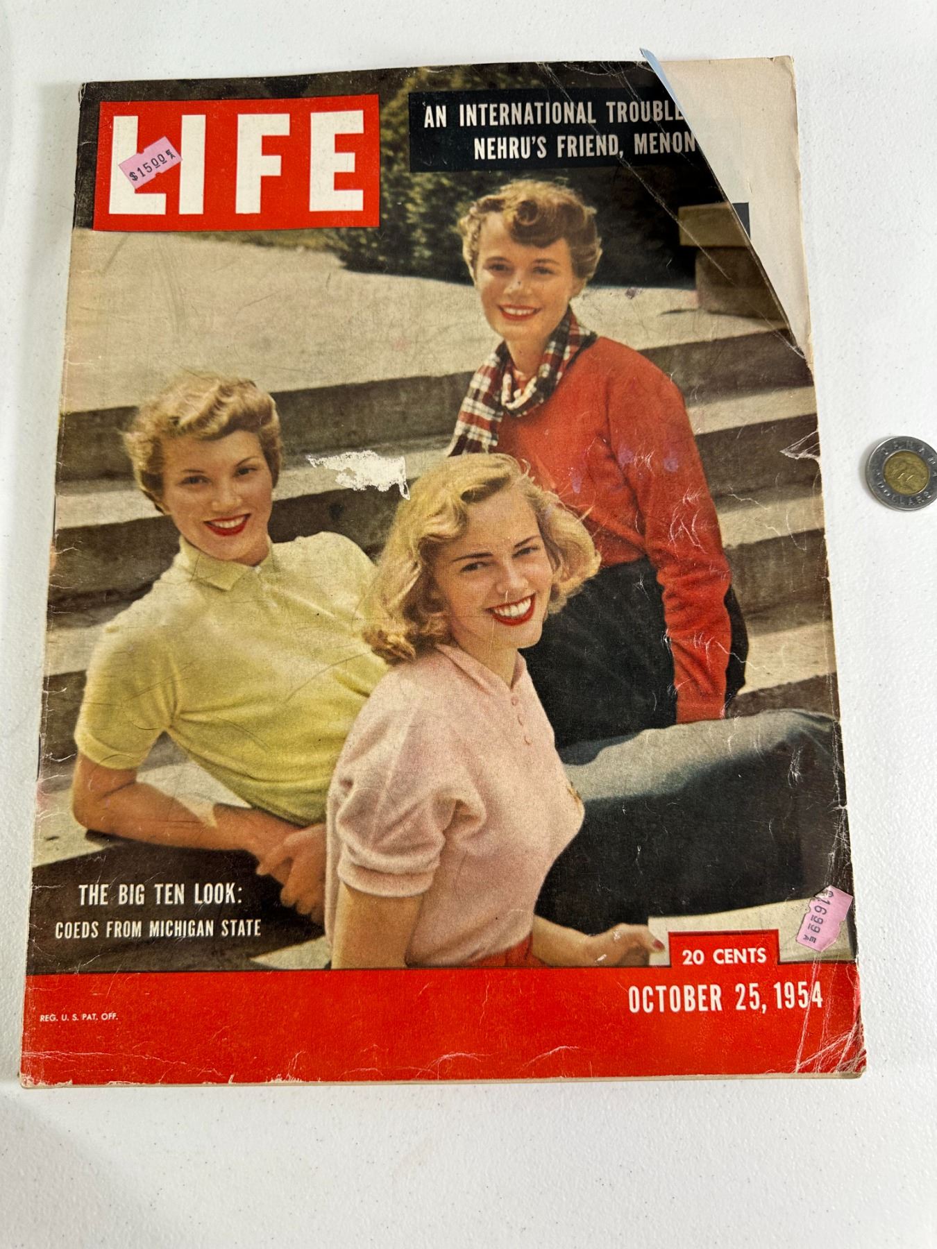 Original 1954 Life Magazine featuring The Big Ten Look: Coeds from Michigan State and a Lucky Strike ad with Ted Williams on the back cover. Condition: Fair to good with edge wear.