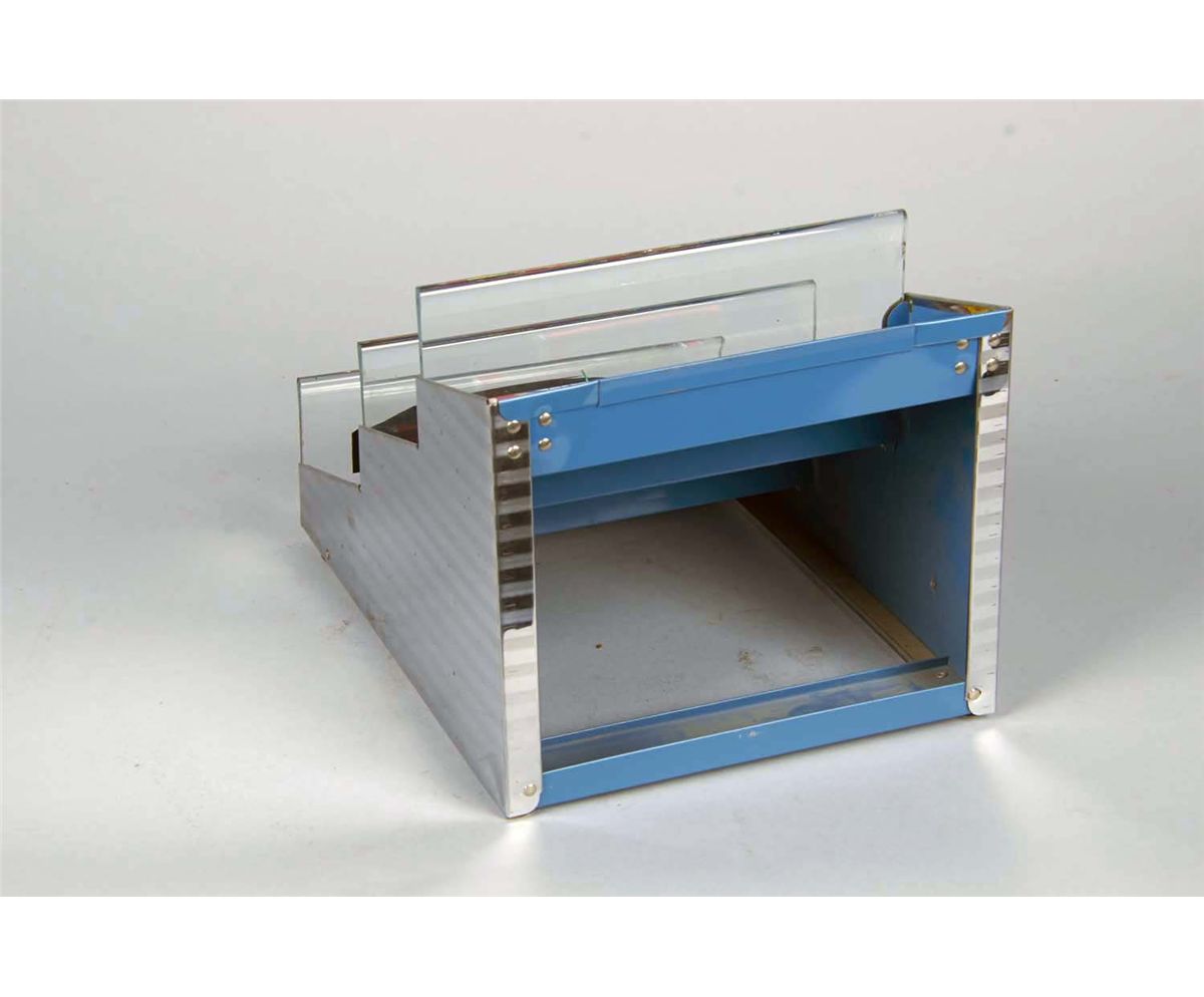Light blue, features 3 rows and reverse on glass logo. Condition (Excellent). Size 12" x 9.25" x 7.5"