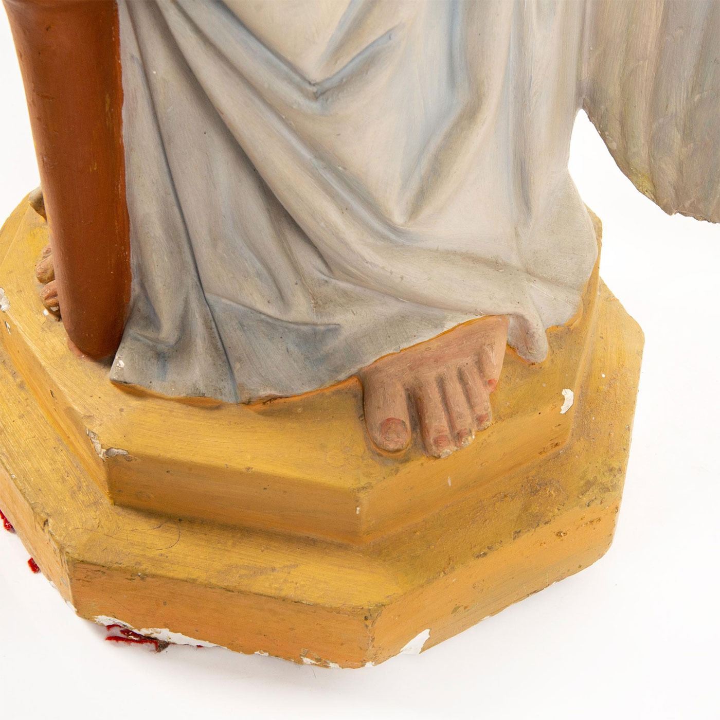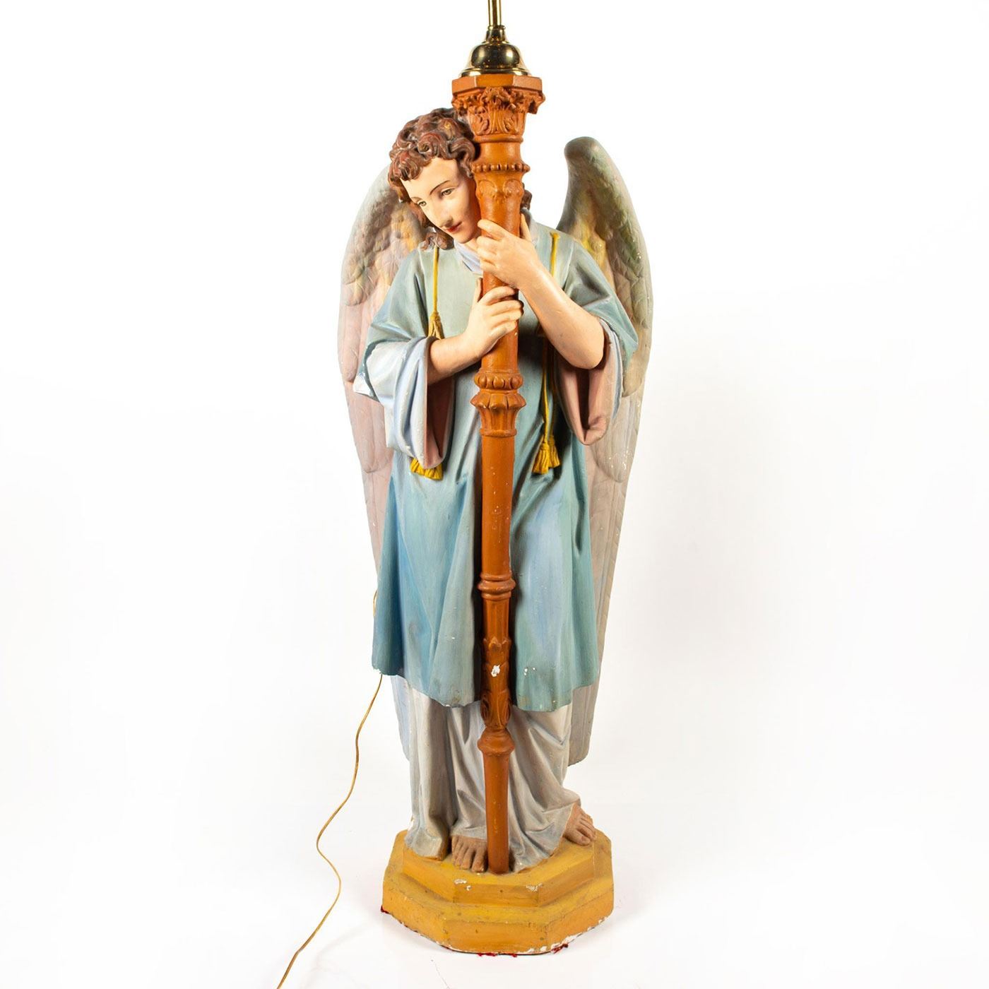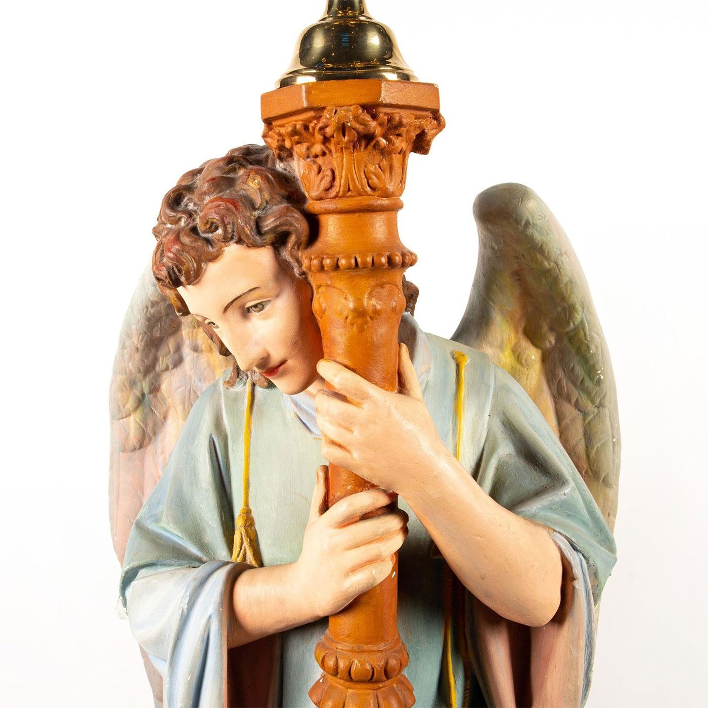 Beautiful exquisite sculpture of an Angel bracing against a column, blue coloration. Gold colored candelabra, with electric bulbs, sit on top the column. Functional electric bulbs. Chip to the right sleeve.