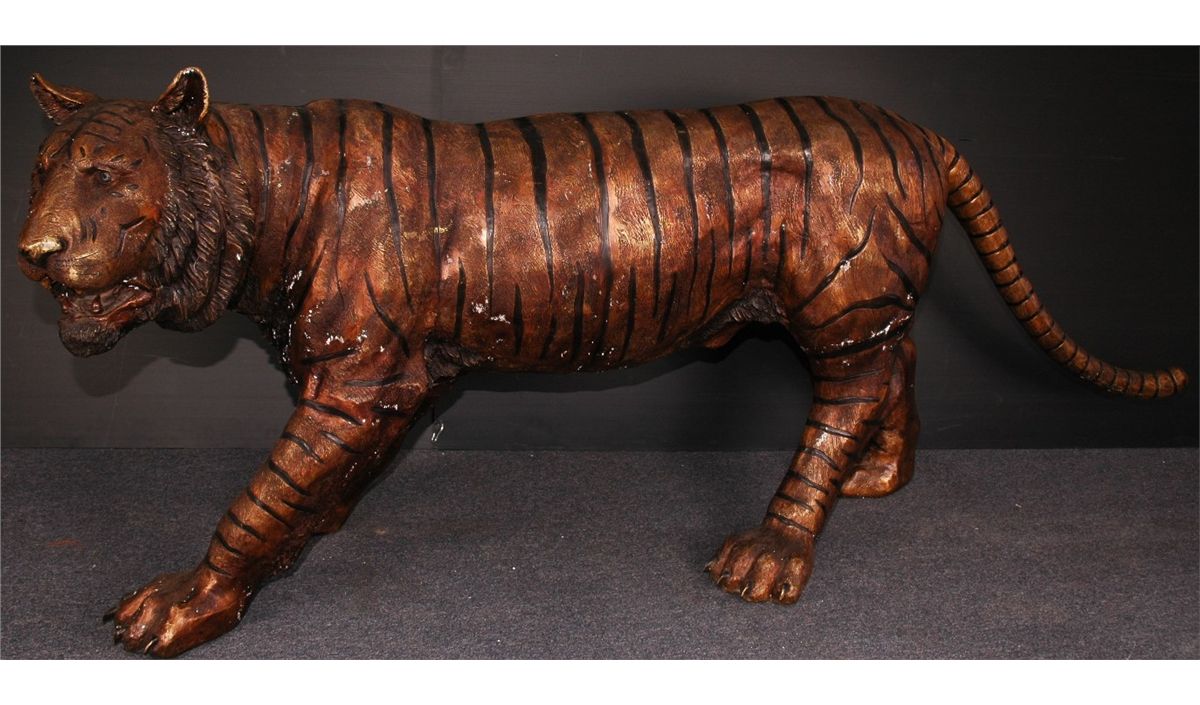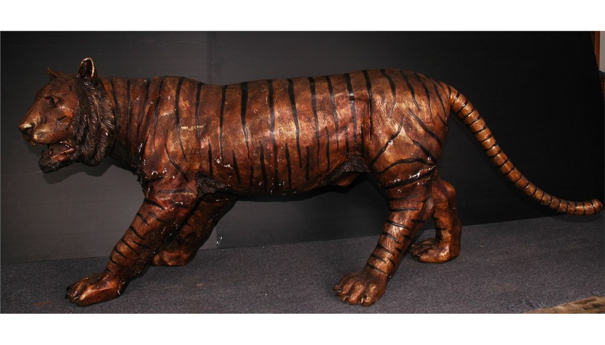 Bronze statue of a life size tiger walking. 36"H x 91"L x 16"W
