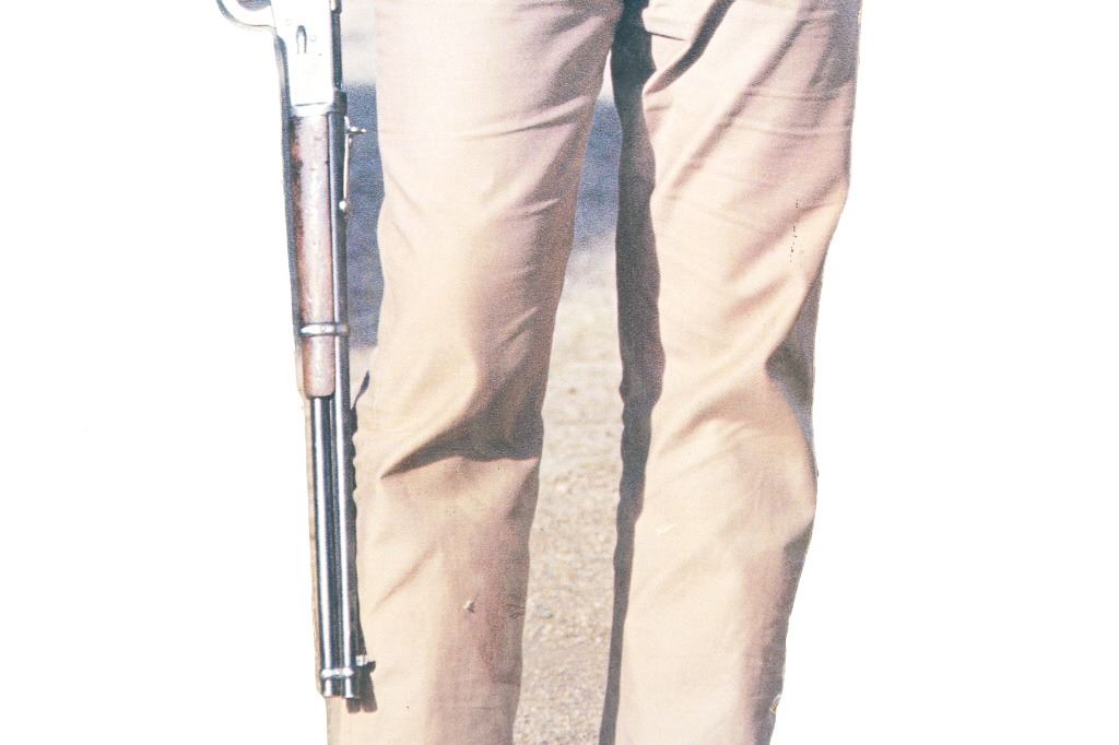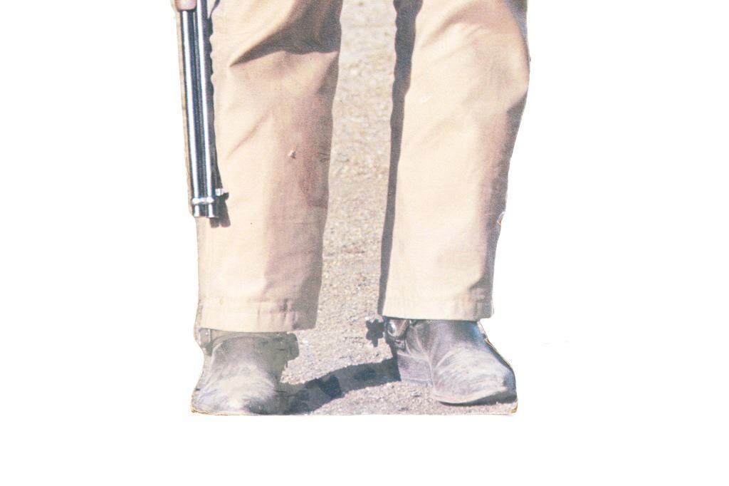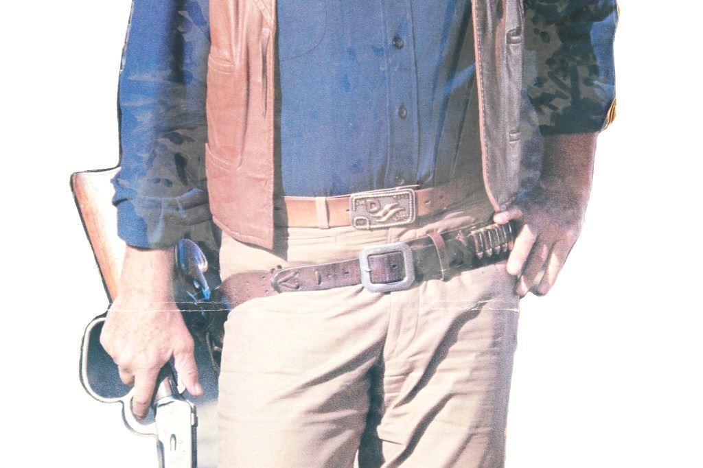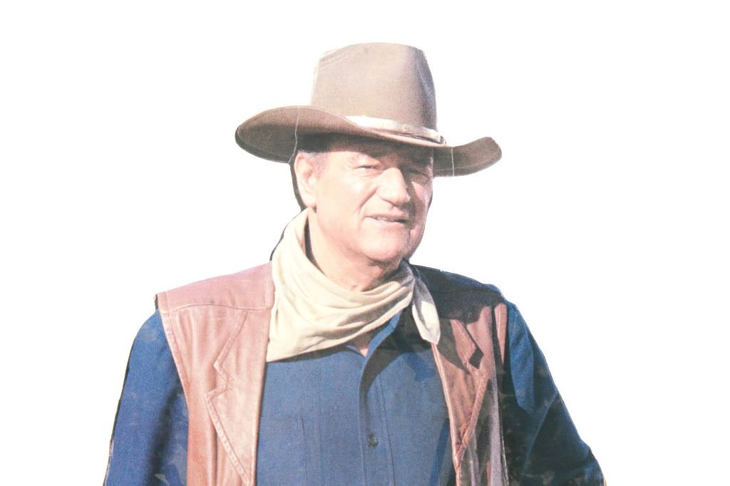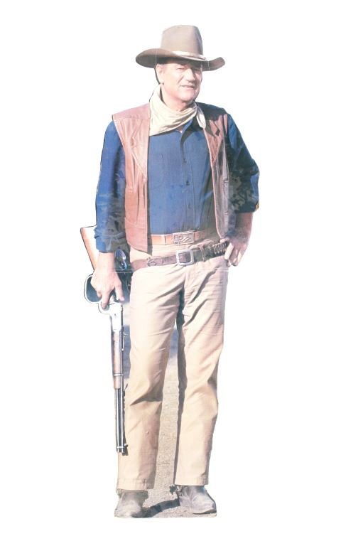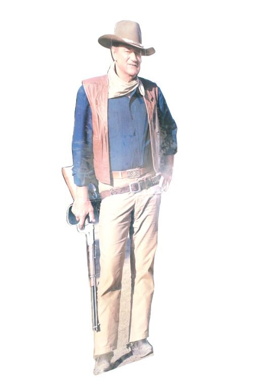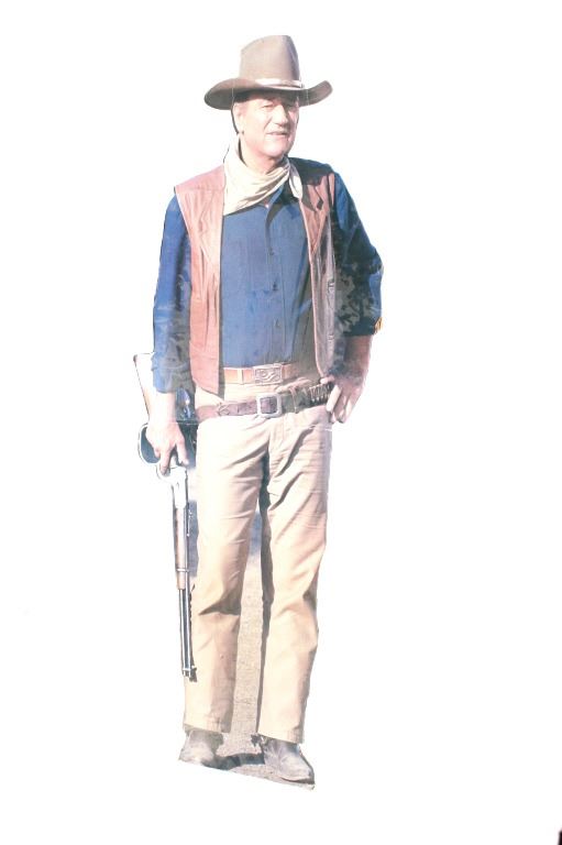Featured in this lot is this life-sized John Wayne cardboard cut-out. The cut out features a wonderfully and professionally crafted cardboard construction that shows the actor in his typical western getup with gun belt slung across his right hip and Winchester 92 with large loop lever in his hand, at his side. The cut out shows a fold mark just below waist height and features folding panels at the rear to enable the cut-out to remain upright. A fine piece for the appreciator of classic Western films. The condition of this John Wayne cutout is well preserved condition with some bends to the cardboard but otherwise is well preserved. The measurements of this John Wayne cutout is 74 1/2" x 25 1/2" x 11".