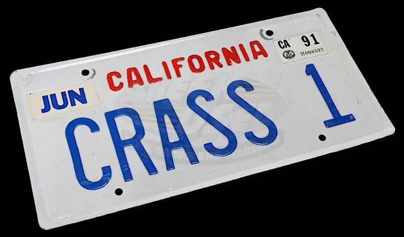 (Brooksfilms, 1991) This prop metal license plate was custom-made for filming and features the word "CRASS 1" in raised letters. The plate can be seen early in the film on Goddard Bolt's limo. The plate still has the registration stickers attached and is in good condition with minor wear from use.