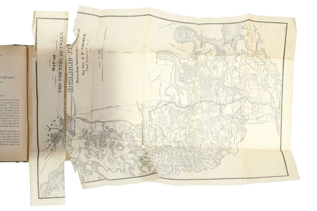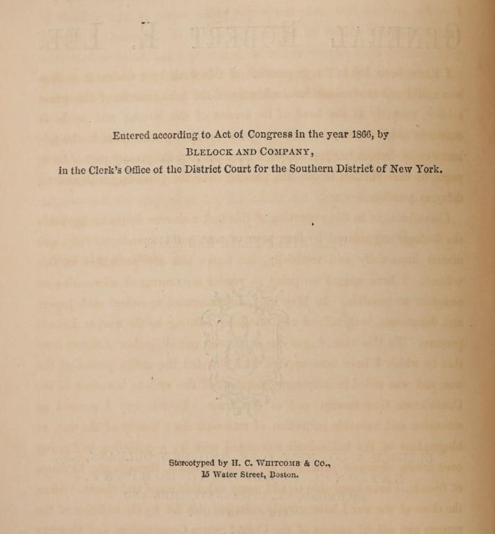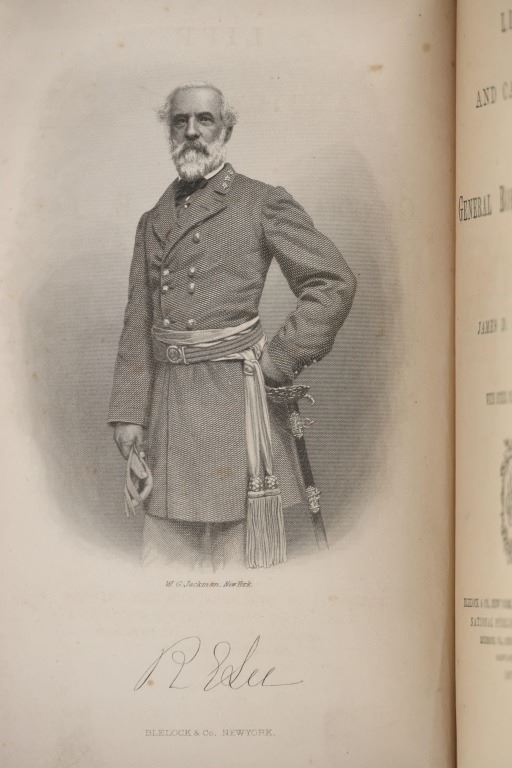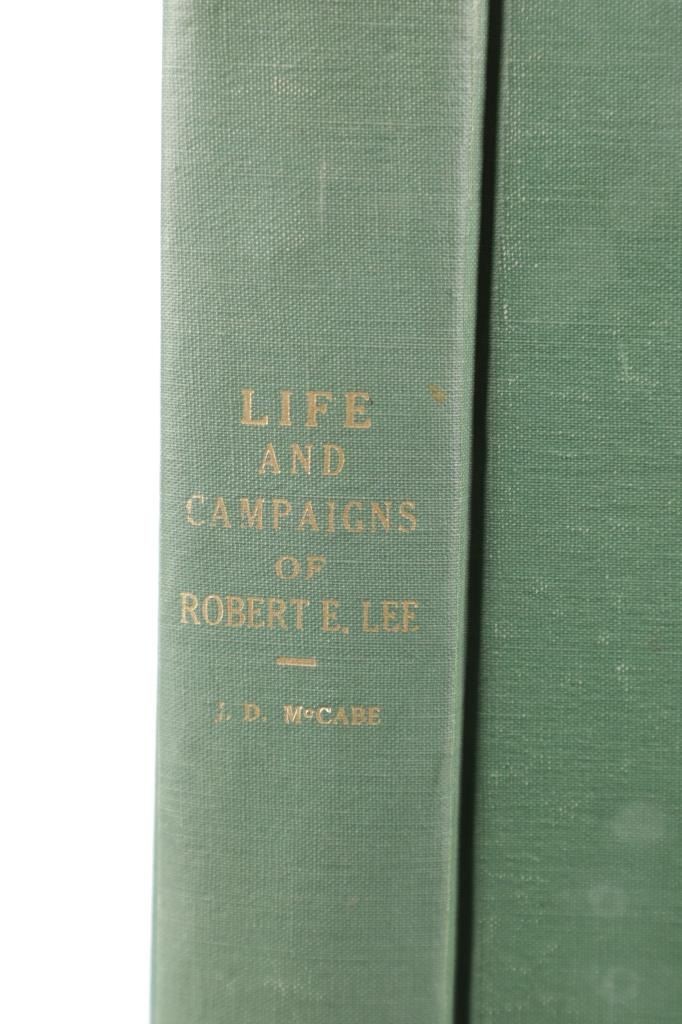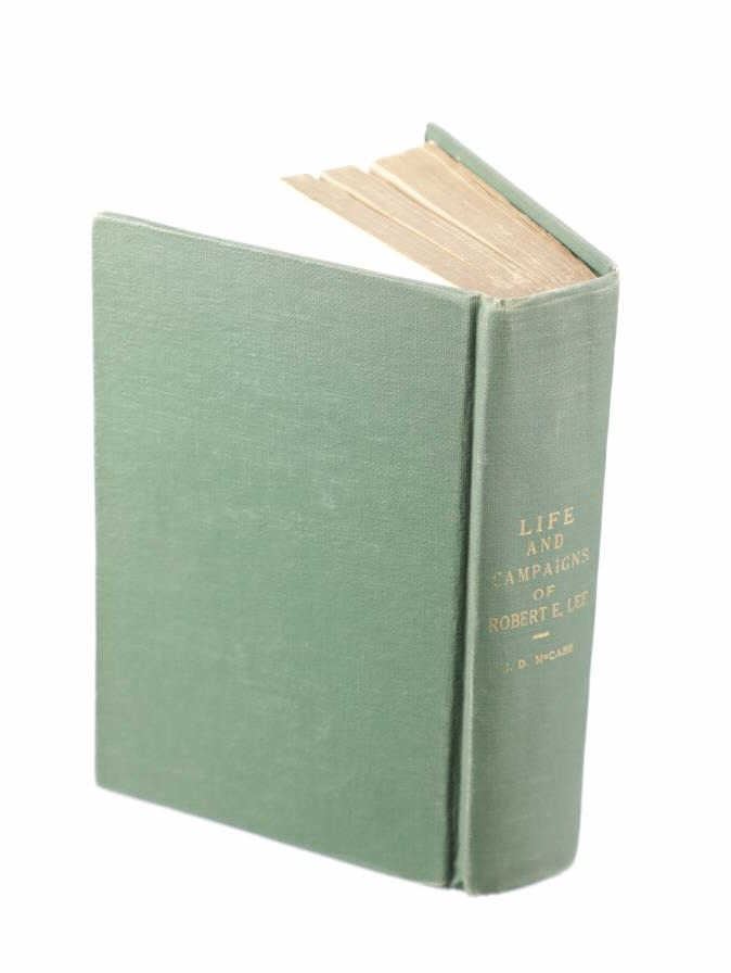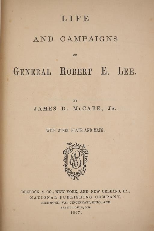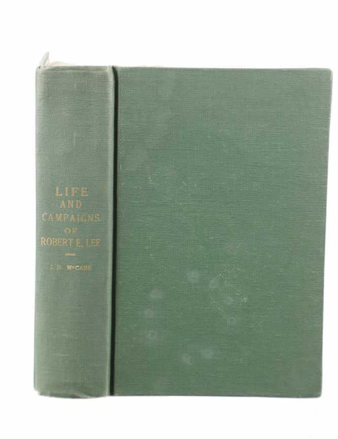 For your consideration is a First Edition of "Life and Campaigns of General Robert E. Lee" by James D. McCabe Jr., 1867, Blelock & CO., New York and New Orleans, LA.; National Publishing Company, Richmond, VA., Cincinnati, Ohio; and Saint Louis, MO. A comprehensive biography of the Commander of the Confederate Army, one of the most prominent and controversial figures in American history - General Robert E. Lee. The book covers Lee's life from his birth in Virginia in 1807, through his military career, and up until his death in 1870. The author describes Lee's early life, his education at West Point, and his service in the Mexican-American War. The book also covers Lee's decision to resign from the United States Army and join the Confederate Army during the American Civil War, where he became one of the most successful and respected generals of the Confederacy. The book provides a detailed account of Lee's military campaigns, including his victories at Fredericksburg and Chancellorsville, as well as his defeat at Gettysburg. The author also explores Lee's personal life, including his marriage to Mary Custis Lee and his relationship with his family. Throughout the book, the author presents a balanced view of Lee, acknowledging his military prowess while also acknowledging his role in the defense of slavery. The book also explores the legacy of Robert E. Lee and his impact on American history. Overall, "Life And Campaigns Of General Robert E. Lee" is a comprehensive and engaging biography that provides readers with a detailed look at the life and career of one of America's most controversial and influential military leaders written just a year after the war had ended and four years before Lee's death in 1870. McCabe's well respected biography of General Lee and account of the Civil War, known for its objectivity and detail; rather scarce with the original folding maps. James Dabney McCabe, Jr. (1842-1883), was a Virginia clergyman and prolific author. He wrote histories and biographies as well as plays, poetry, and travel guides. His papers and correspondence are collected at Johns Hopkins University and include communications with Robert E. Lee, George E. Pickett, and George A. Rosecrans. This green cloth bound gold gilt hardcover is in nice condition, slight scuffing exhibited on edges. Intact pages with age tanning and foxing throughout. Measures 5.5"W x 8.5"L x 1.1.5"D, weight 2lb.