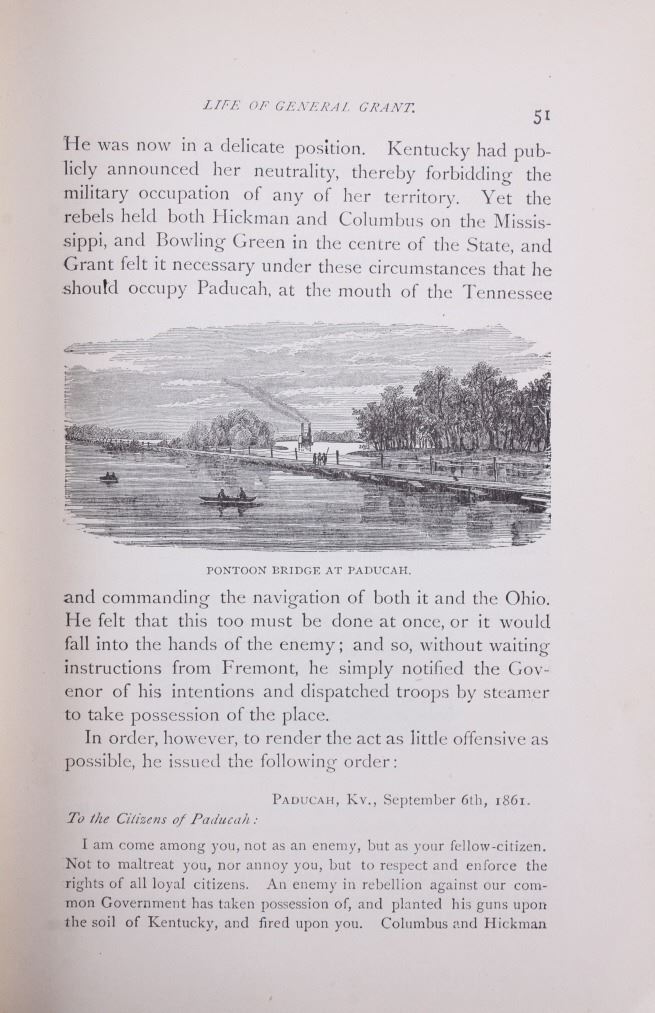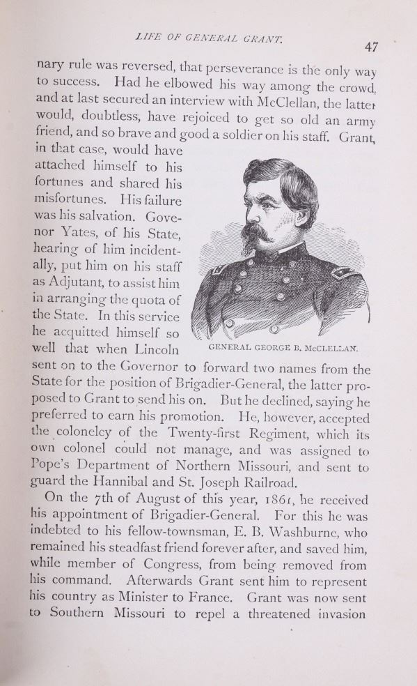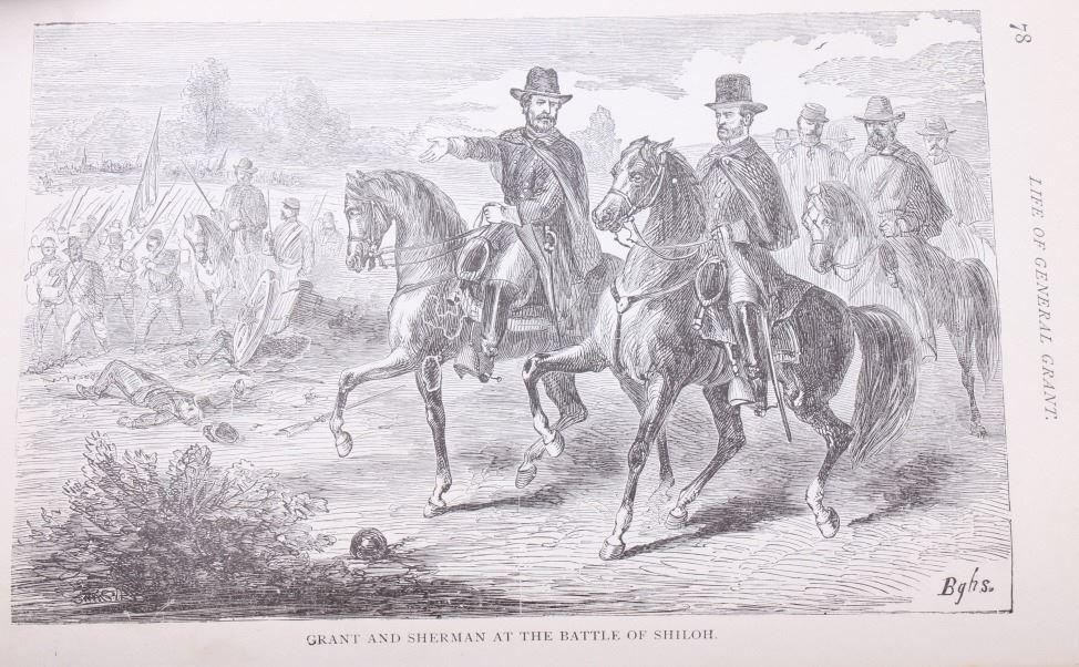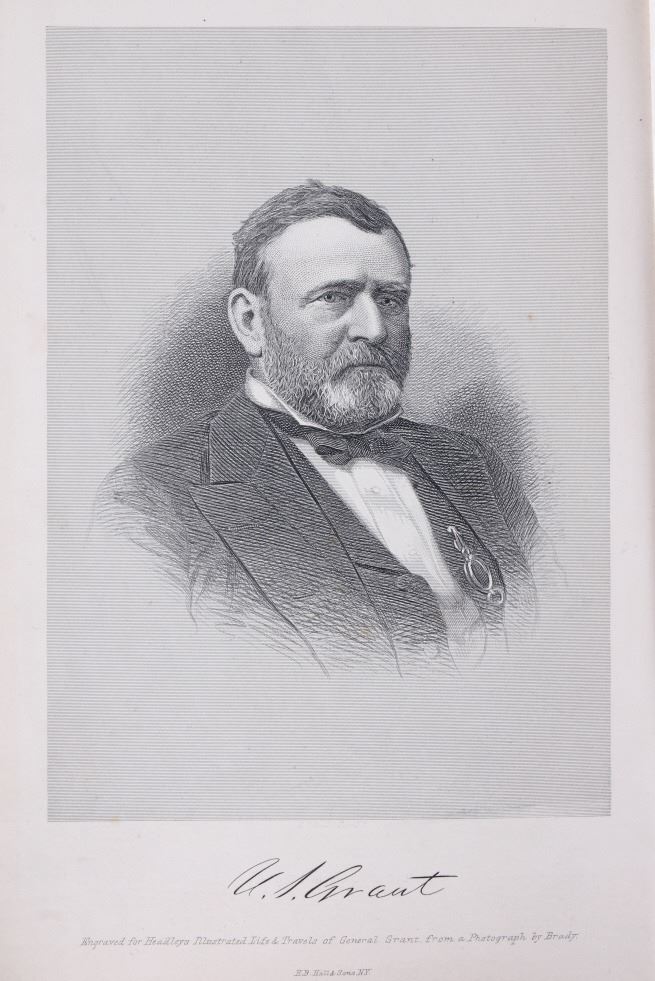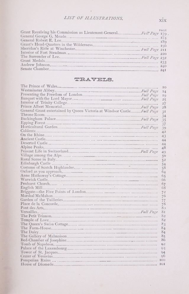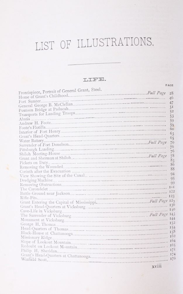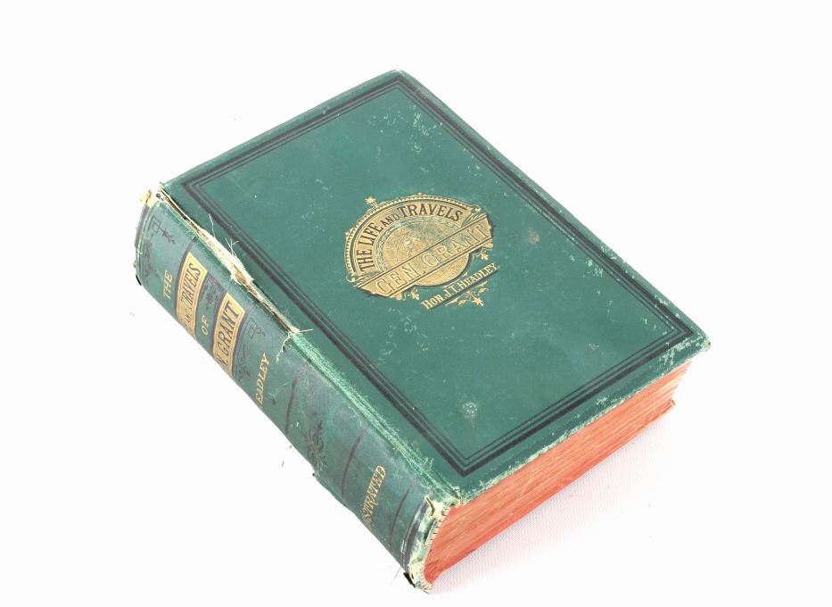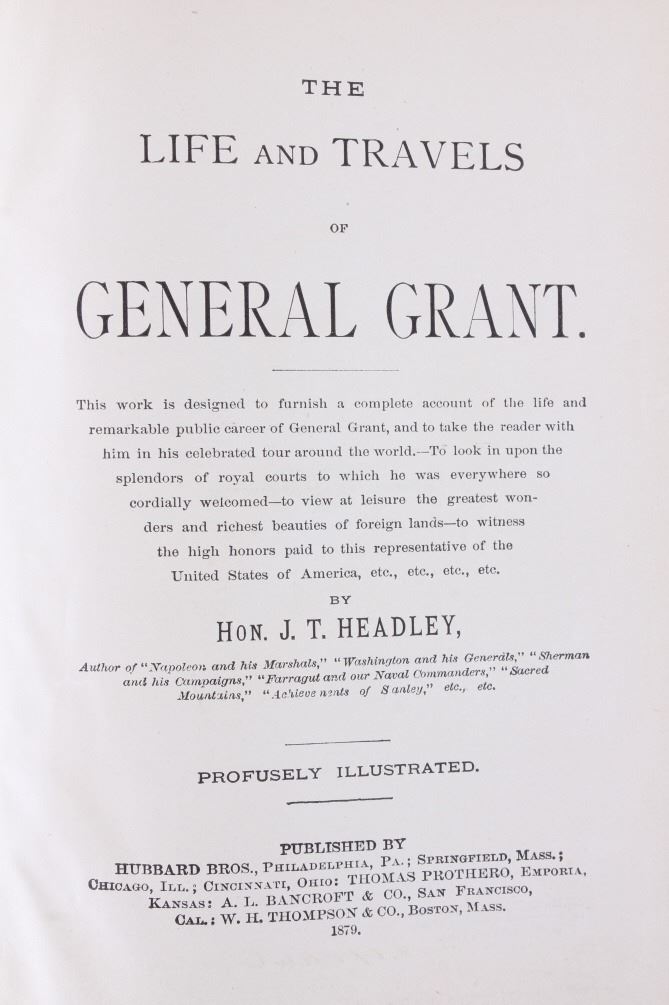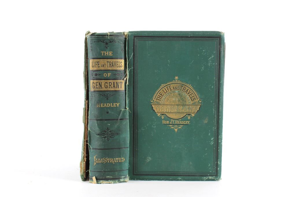 In this lot we have a first edition of "The Life and Travels of General Grant" written by Hon. J.T. Headley and published in 1879. The book is a wonderful biography of the famed Civil War General and later President of the United States. The book is profusely illustrated with a beautiful gilt decorated cover and spine. There is a label on the inside front cover indicating "Library of J.H. Voorhees. No. 116," This book shows used and age on the binding, and the front cover has started to attach, and the back has completely detached. The book measures 6" x 9".