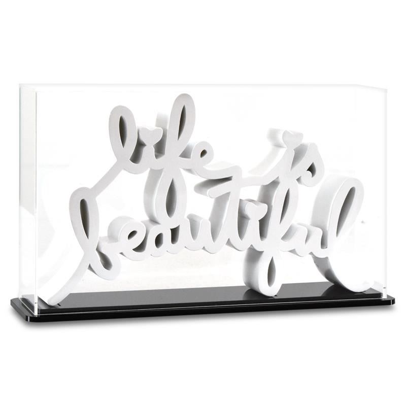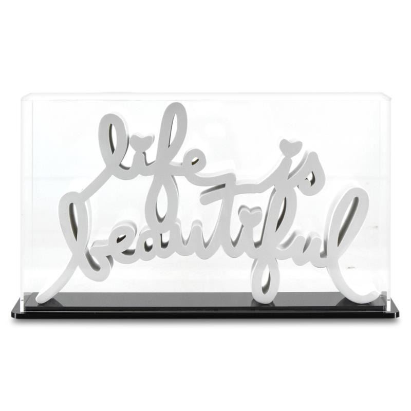 "Life is Beautiful (White)" is a limited edition resin sculpture by Mr. Brainwash, numbered 6/70 and hand signed by the artist. This piece comes with an acrylic display case. Includes Certificate of Authenticity. Measures approx. 12" x 7" x 2".