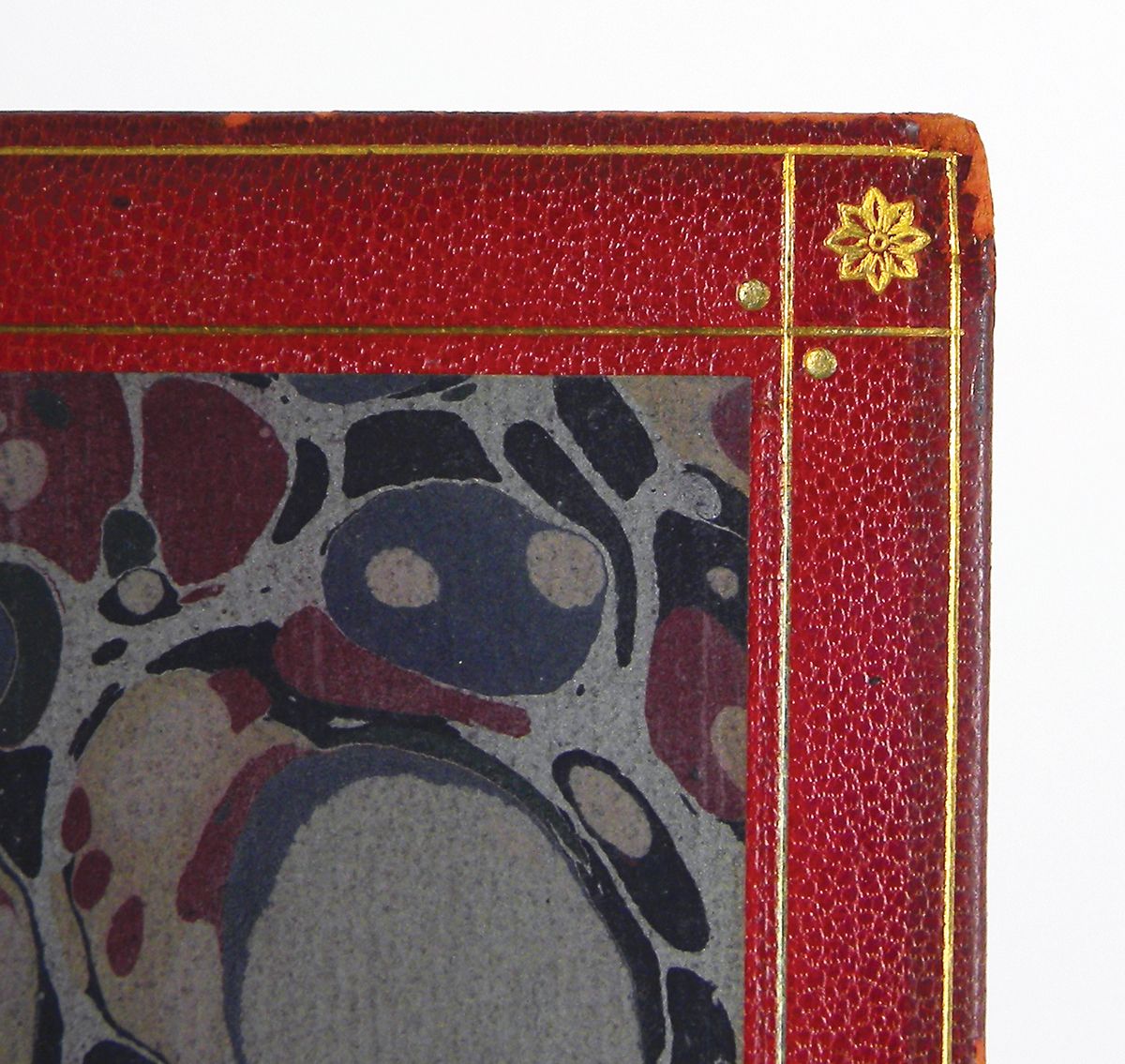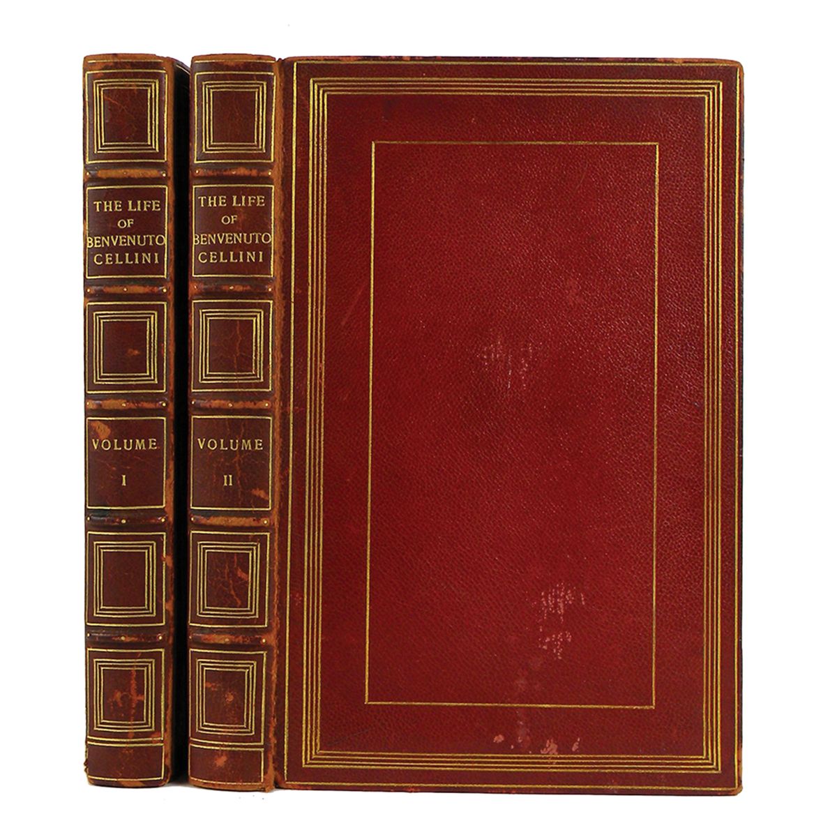Cellini, Benvenuto. THE LIFE OF BENVENUTO CELLINI WRITTEN BY HIMSELF. Edited and translated by John Addington Symonds. New York: Brentano's, 1906. Two volumes. 8vo, contemporary red full morocco; covers intricately paneled with six gilt fillets; spines with five raised bands, four resulting compartments decorated with gilt fillets in geometric arrangement, others lettered in gilt; gilt turn-ins; marbled endpapers; top page edges gilt; silk marker. xxix, (1), 359, (1) + vii, (1), 386, (2) pages; 40 plates with tissue guards. Bindings rubbed, but sound and still attractive. Near fine. The famous autobiography of this important Italian artist and medallist, as translated into English by John Addington Symonds.