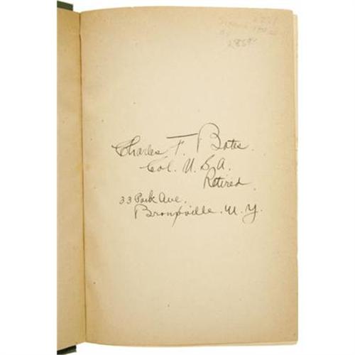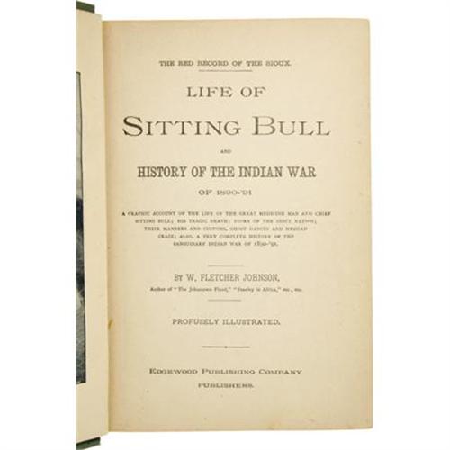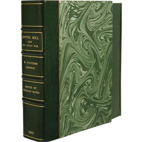 <B>Charles F. Bates: Colonel Bates Copy, with His Signature, of <I>Life of Sitting Bull and the History of the Indian War of 1890-'91.</B></I></B></I> A Graphic Account of the Life of the Great Medicine Man and Chief Sitting Bull; His Tragic Death; Story of the Sioux Nation; Their Manners and Customs; Ghost Dances and Messiah Craze; Also, a Very Complete History of the Sanguinary Indian War of 1890-'91. By W. Fletcher Johnson. Profusely Illustrated. ( Philadelphia : Edgewood Publishing Company, 1891 ). First edition, with the signature and address of Col. Charles F. Bates (U.S. Army, retired) on a preliminary leaf. Bates was a Custer biographer and author and a friend to Mrs. Elizabeth Custer. Two terminal leaves have pencil notes by bates referring to page numbers in the book. Octavo (7.5” x 5”). 587 pages. Illustrated. Publisher's green-gray cloth pictorially stamped and lettered in gilt and reddish-brown on the front cover and spine. Housed in a custom quarter morocco book-backed slipcase with four raised bands and gilt tooling on the spine.<BR><BR><b>Shipping:</b> Books & Catalogs (<a target="_blank" href="http://www.heritageauctions.com/common/shipping.php">view shipping information</a>)