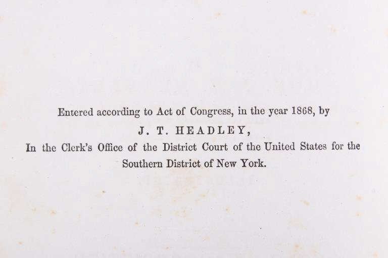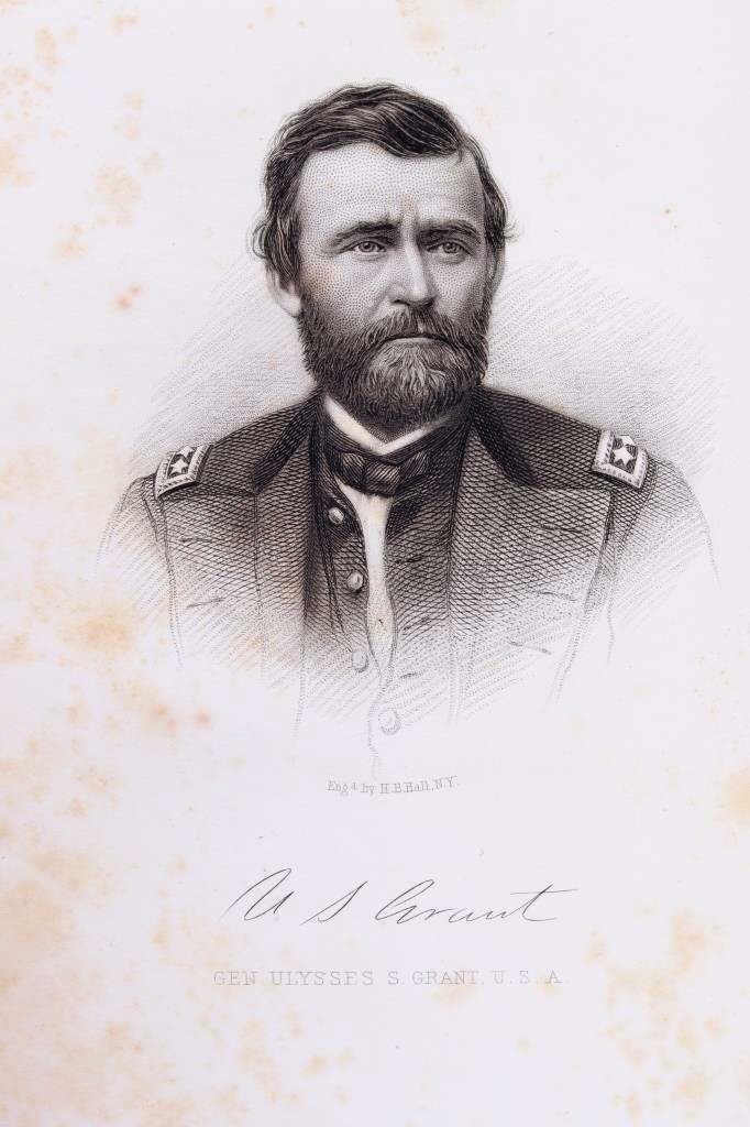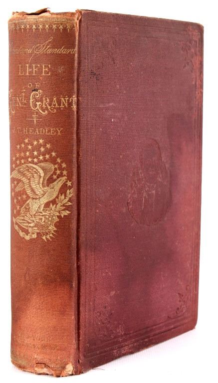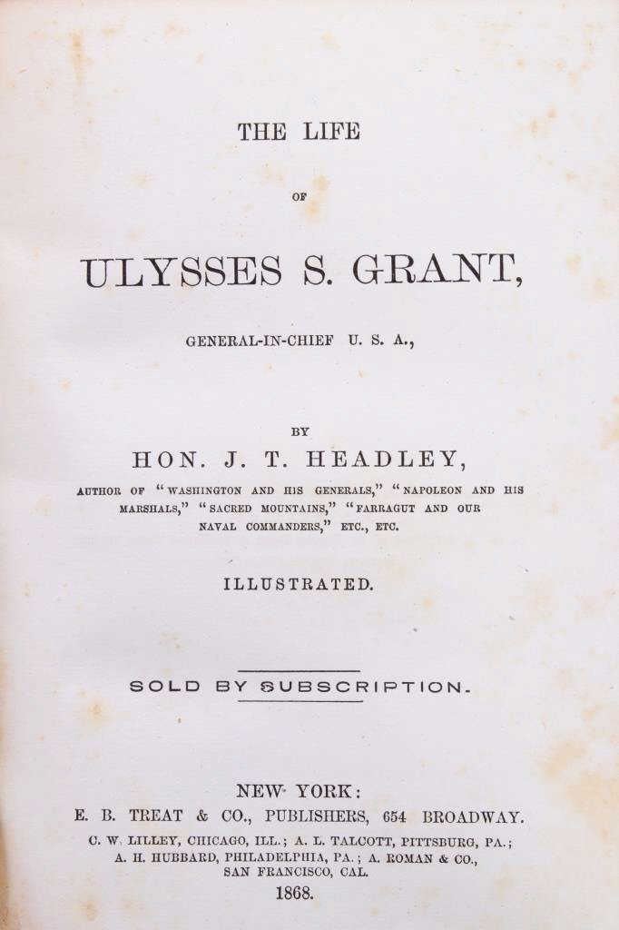 For your consideration is this rare 1868 first edition of "The Life of Ulysses S. Grant", by Hon. J.T. Headley. This was a special edition book sold only by subscription with very few copies still remaining. The book tells the thrilling true tail of our General-In-Chief and later President of these United States with excellent illustrations. The book was published by E.B. Treat & Co., Publishers 654 Broadway New York along with C.W. Lilley Chicago, ILL. A.L. Talcott, Puttsburg, PA., A.H. Hubbard Philadelphia, PA., A. Roman & Co. San Francisco, CAL. Printed by The Trow & Smith Book Manufacturing Company, New York. The book shows the original cloth binding with gilt decoration on the spine and cover, though the gilding on the cover is mostly rubbed off. The cover does show an excellent pressed portrait of General Ulysses S. Grant "framed in filigree. The spine is marked in gilt lettering and shows the U.S. Eagle. The book pages show moderate to heavy foxing and signs of being stored in damp conditions, but the book is in good condition over all for its 150 years. Measures 8 3/8"L x 5 5/8"W x 1 5/8" Thick.