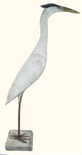 Life size great blue heron decoy in XOP with in use wear to the surface. Body is made with three vertical pieces of wood. Mounted on two legs to a rectangular wooden base with a screw eye on the edge for an anchoring stake. (decoy)