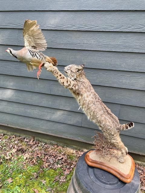 Very Nice Life-sized Leaping BOBCAT clawing at a CHUKAR PARTRIDGE. The mount measures 40" Tall and the Wood Base measures 15" Long x 10" Wide. Great spots on the Cat! TAXIDERMY