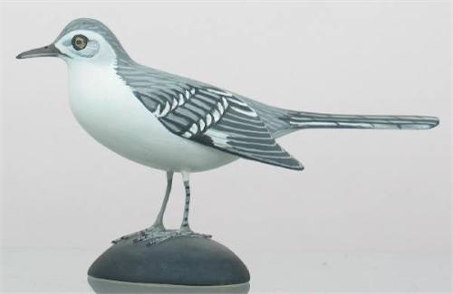 Life sized mockingbird with painted eyes and drop wings. "Mockingbird" and "James Lapham, Dennisport, Mass" on the bottom in ink. XOC. (decoy)