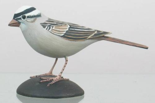 Life sized white crowned sparrow with split wings and tail detail. "White Crowned Sparrow" and "James Lapham, Dennisport, Mass" on the bottom in ink. XOC. (decoy)