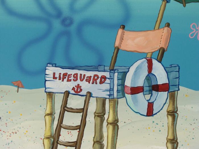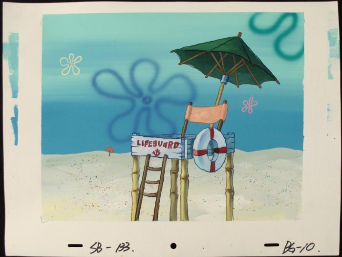 This original hand-painted background from the Nickelodeon TV show SpongeBob Squarepants. The story takes place under the deep blue sea in Bikini Bottom, where SpongeBob resides. SpongeBob, who is a yellow, porous sponge, is your typical happy-go-lucky character, as he is always cheerful and enjoys making people laugh. Patrick Star, SpongeBob's neighbor who is a starfish, is your average children's show idiot, as he boasts knowing nothing and is often getting himself into ridiculous situations. Between the homes of these two lies the home of the miserable Squidward, a squid, who is known for being grouchy and playing tricks on SpongeBob and Patrick. Both SpongeBob and Squidward work at the Krusty Krab, a fast food business run by the greedy money-loving Mr. Krabs, a crab, the arch rival of the evil, possibly misunderstood, Plankton. Another neighbor, Sandy Cheeks, an athletic squirrel who normally wears an astronaut's space suit, was introduced in "Tea at the Treedome." She spends most of her time inventing and experimenting. This is the lifegaurd tower.Original Production Background Overall Size of Background: 10 1/2" x 13 3/4" Very good conditionOriginal Production Backgrounds are used in the making of the final version of animated productions. The background establishes the location and the overall good mood of the scenee. Typically, a background layout artist creates a drawing to establish the content of the scene, placement of characters, perspective and camera angle. Based on this drawing, the background artist creates a preliminary painting to confirm all of the scenes details, then the final production background which is used in the filming of the scene. When these backgrounds are individually photographed behind the progression of production cels, and projected at a rapid succession, the images in the foreground appear to move, creating an animated scene. The background is ready to be matted and framed. It is a colored background with the animator's notations at the bottom.