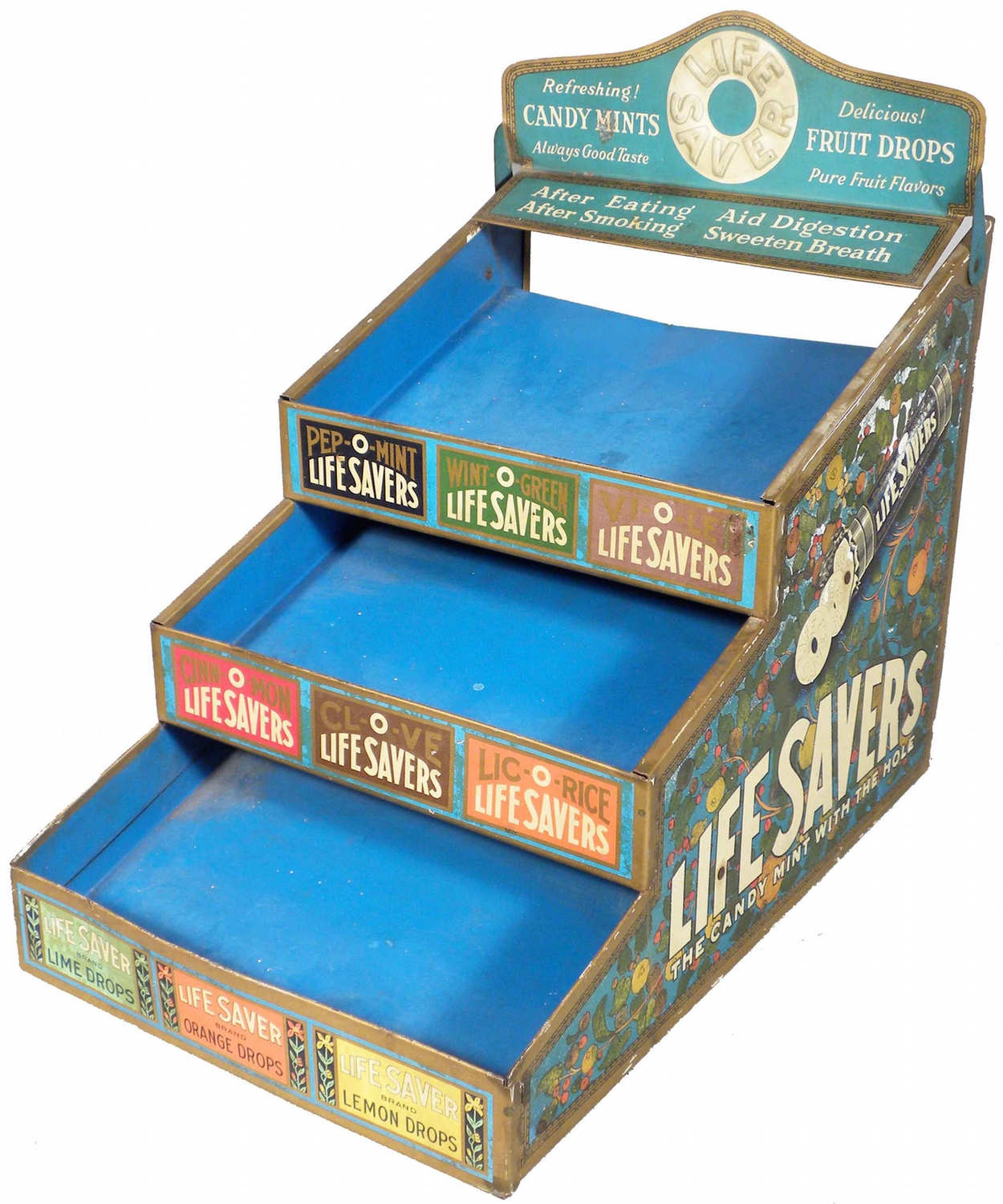 Lifesavers Tin Litho Store Display. Embossed marquee. Very good condition. 10 X 14 1/2 X 15 inches.