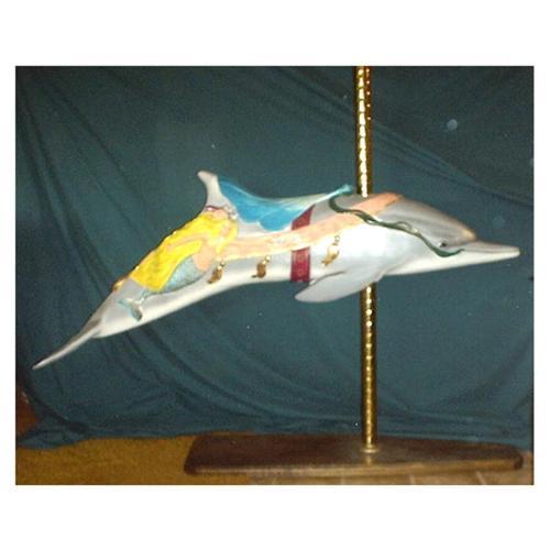 <table width="100%" border="0" cellspacing="0" cellpadding="4"><tr><td><em> Life Size,5 feet long,on base, Carousel Dolphin</em></td></tr><tr> <td width="100%"> Full size 60" long, life-like dolphin with lovely mermaid, shells, and ribbons on her side. This is a new design that was made for a famous park, she is jumping the waves.<p>This Dolphin has glass eyes, and is all hand painted (by Carousel Workshop). On the Dolphin's side is a mermaid with blond flowing hair,sea shells in her hair. Her tail is silver leaf, with overpainting of blue green.There is a dark green ribbon flowing from her to the Dolphins mouth, and a purple belly strap to hold the blue green Shell saddle. The Breast collar is light peach with gold leaf tassels.<p>This wonderful piece is mounted on a base and and has a twisted brass pole with a ball top. <p> you could even shorten the pole and use on a plant shelf.<p> Delivery F.O.B. DeLand, Florida by truck. </td></tr><tr> <td> </td></tr><tr> <td>Reference #: 16R</td></tr><tr><td>Condition:New</td></tr><tr><td>Year:2000</td></tr><tr><td>Width:60</td></tr><tr><td>Title:Lifesize Carousel Dolphin Not Carousel Horse</td></tr><tr><td>Style:Dolphin with Mermaid</td></tr><tr><td>Materials:Fiberglass</td></tr><tr><td>Location:Deland, Florida</td></tr></table>