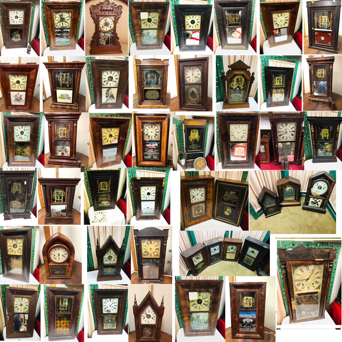 Lifetime clock collection including rare antique clock makers! The collector is now in his 80s and is ready to pass on his collection. Many of the clocks were in working order when we picked them up at the estate. The owner enjoyed watching the beautiful movements of the clocks and that is why many of the clock faces are removed, although still with the clock and easily put back in! Lifetime clock collection includes approx. 48 clocks: Smith and Goodridge, OG Shelf Clock, Wm. L. Gilbert Gingerbread Shelf Clock - Trout, Waterbury Clock Co. Shelf Clock, E.N. Welch Mantel Clock, OG Split Door Ansonia Clock Co. Clock, Joel Lane OG Shelf Clock, Waterbury Clock Company Mantel Clock, E.C. Brewster and Co. OG Shelf Clock, Chauncey Jerome OG Shelf Clock, George Marsh OG Shelf Clock, Wm. L. Gilbert OG Shelf Clock, Waterbury Clock Co. Shelf Clock, Waterbury Clock Co. OG Shelf Clock, William L. Gilbert "The General" Shelf Clock, Chauncey Jerome Shelf Clock, Waterbury Clock Co. OG Shelf Clock, OG Shelf Clock, US Capital on Lower Glass, L & F Andrews, OG Shelf Clock, Waterbury Beehive Clock, Waterbury Clock Co. Steeple Clock, Welch Steeple Clock, Riley Whiting Shelf Clock, Welch OG 8 Day Shelf Clock, Southern Clock Co. OG Shelf Clock, 4 Ogee Shelf Clocks, JJ Beals and Co. OG Shelf Clock, EC Brewster and Co. OG Shelf Clock, L & F Andrews, OG Shelf Clock, William S. Johnson, Wooden Works Clock, Waterbury Clock Co. Cased Clock, Waterbury Clock Co. Shelf Clock, Seth Thomas Shelf Clock, Ansonia Brass Co., OG Shelf Clock, International Time Recorder, Ansonia Clock Co. Parlor Clock, 2 Ogee Shelf Clocks, William S. Johnson, Clock Case, Orrin Hart Shelf Clock, Seth Thomas Mantel Clock, Seth Thomas Shelf Clock, Henry Smith Wooden Works Clock, and 3 Steeple Clocks. Autioneers note, because we are offering for one money, does not reflect what the owner paid for these clocks. This is all one collection and it would be nice to keep it together. Owner originally paid $200-$400 each when original purchased. This is one time opportunity! Local Buyers take notice: This lot can be picked up by appointment with Tim Chapulis, Auctioneer, in Bristol, CT.