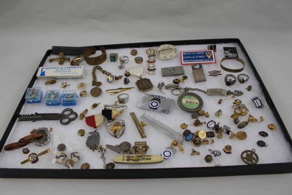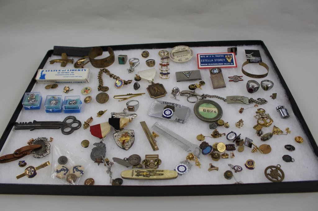 tacks, buckles, pins, fobs, hotel keys and misc. collected by Dr. Herdig, Mayor and friend to Reagan. About 100 items. Est:$100-500