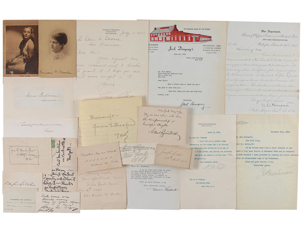 An absolutely amazing collection of over 20,000 items which encompasses many fields of autograph collecting, and spans from the 1800s to the mid-to-late 20th century. Collection consists of signed photos, carte-de-visites, signatures, letters (in English and foreign languages), autograph albums, and a smattering of other formats. Much of the collection is housed in three-ring binders and two jam-packed file cabinets. The vast array of notables contained in the collection span from presidents and first ladies, politicians, Nobel Prize winners, Civil War officers, luminaries of stage and screen, authors and poets, composers, musicians, opera and ballet, artists, and many, many more. Collection rates in overall very good to fine condition. Also due to the vast number of items, a few secretarial/and or printed signatures may be included. Due to the enormity of the collection please be advised that extra shipping charges will apply. The sheer overwhelming volume of items precludes a list, and interested parties are strongly advised to view the collection in person at our offices, as this collection is sold as is, and no returns will be accepted. Collections of this size and scope are seldom offered in whole, and with thousands of pieces, there are undoubtedly still many discoveries that lie within.
