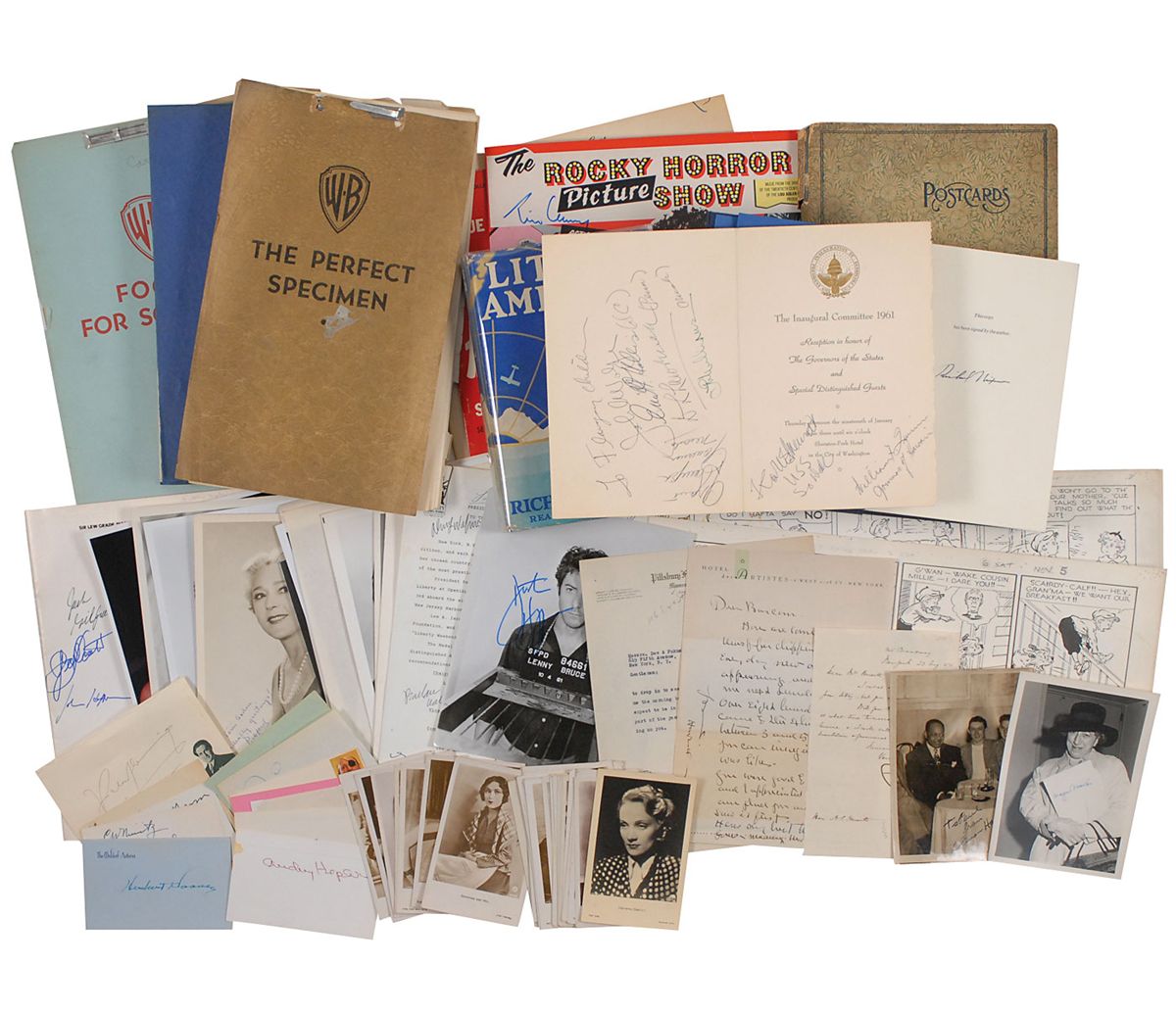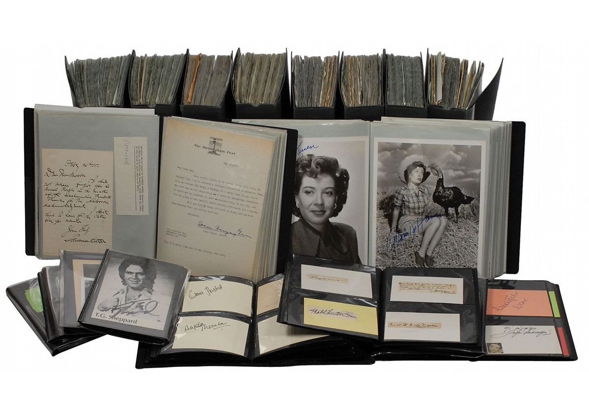 Enormous collection of over 10,000 items primarily encompassing the fields of entertainment, music, art, ballet, opera, and a smattering of various political, sports, and other notable figures. Collection is comprised of a large variety of formats, including many signed and unsigned photos, album pages and autograph books, letters, documents, books, and other miscellaneous memorabilia; this is contained within more than 10 thick binders, over 20 smaller binders, and a number of large bins and boxes.